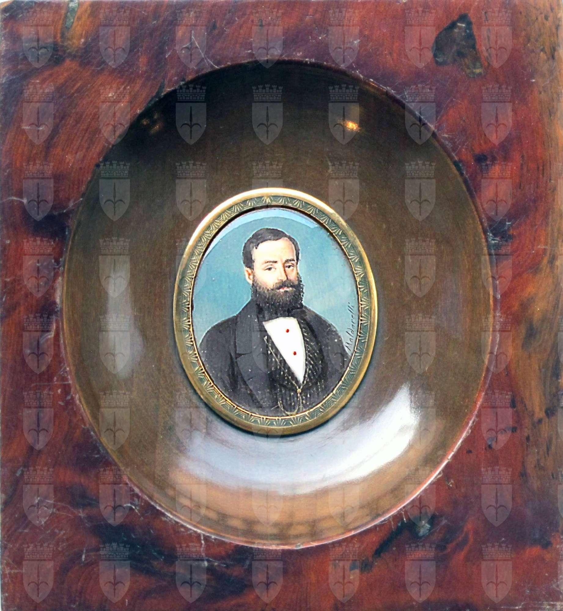 La miniatura, acquistata nel 1935 da Renato Astolfi, è identificata tradizionalmente nel ritratto di Pietro Guerra, impiegato e pittore dilettante. Essa è firmata, lungo il margine destro, da un autore di nome Maldarelli, difficile da identificare. Sebbene nelle collezioni civiche siano attestate più miniature di questo artista, egli non è ricordato nelle principali riviste triestine ottocentesche. Nei repertori è attestato un Maldarella, miniaturista di origine napoletana attivo verso il 1835; Oronzo Maldarello, originario di Napoli, attivo in Italia tra il 1830 e il 1850 (Schidlof 1964, II, p. 525); i pittori Fernando Maldarelli (Napoli, 1826-1893) e Gennaro Maldarelli (Napoli, 1795-1858), cfr. Thieme Becker 1929, p. 589.