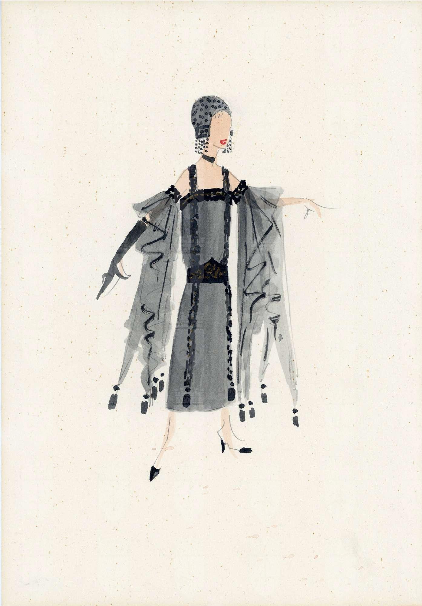 La duchessa di Chicago, operetta di Emmerich Kàlmàn, Figura femminile intera, ambientazione Regno di Silvaria, Vienna, 1920-30. Indossa abito grigio scuro stile Charleston lungo fino al polpaccio, mezze maniche a lembi sovrapposti, cuffia con pendenti con perline, cintura ribassata, decorazioni in passamaneria, guanto al gomito. Decori e spallini neri