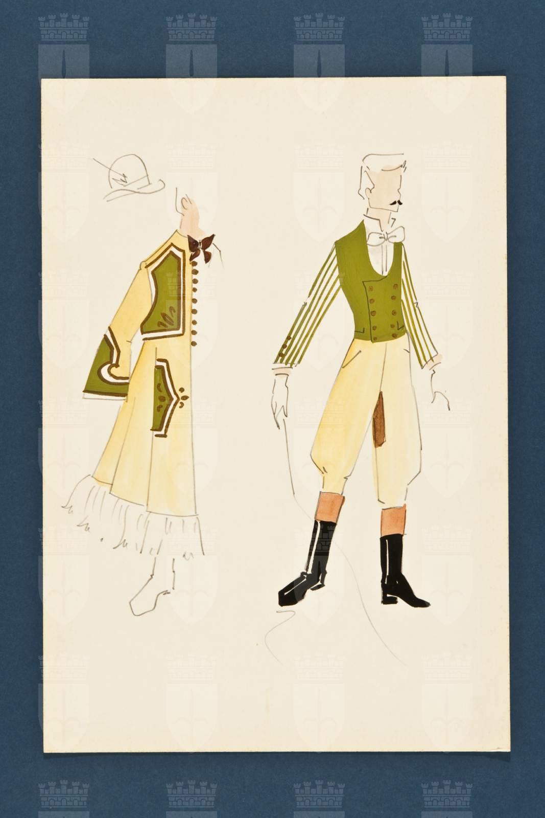 La contessa Mariza, figura maschile, camicia, cravatta a farfalla, giacca e gilet verde a doppia abbottonatura, maniche a righe bianche e verdi, pantalone giallo da cavallerizzo, stivali, guanti, frusta. A sinistra metà figura con soprabito giallo con orlo ampio di pelliccia, decori verdi, bianco e oro e particolare di cappello piumato