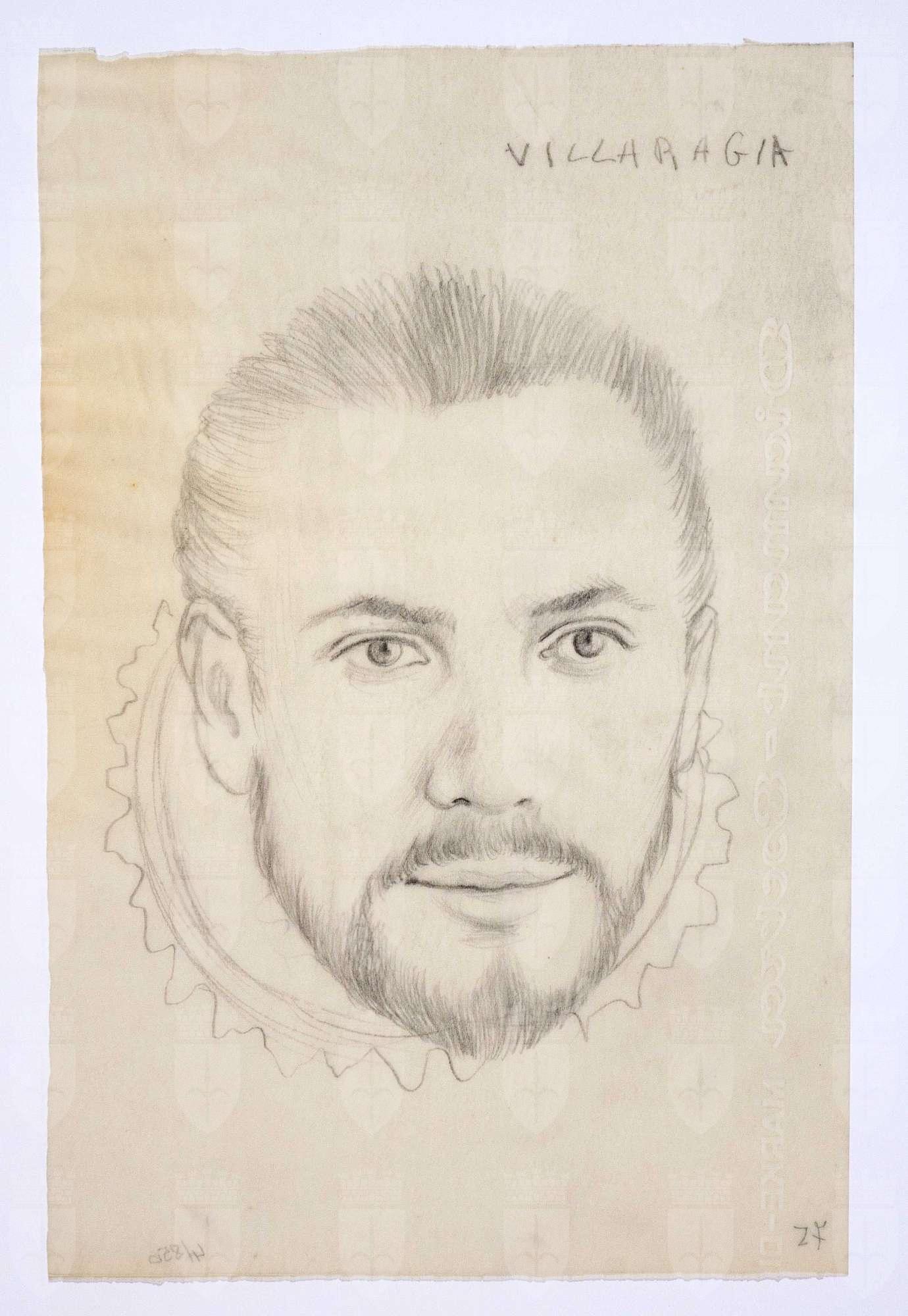 Il gioco dei potenti, libero adattamento di Giorgio Strehler da Enrico VI, dramma storico di William Shakespeare, in 15 atti e 2 giornate. Ritratto di testa maschile di fronte, a capo scoperto, barba e baffi.