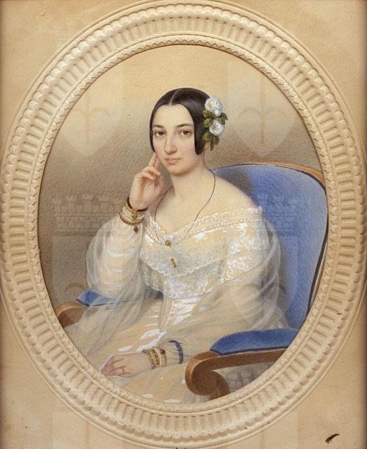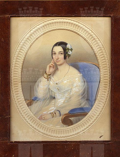 È ritratta Maria Sartorio (Trieste, 1820-Graz, 1892), figlia di Giovani Guglielmo e Carolina Gobbi e maritata nel 1843 con Carlo de Steininger (Vienna, 1804-1867). Sulla biografia dell'effigiata, cfr. Resciniti 2010, pp. 86-87. L’opera è, per la firma, ascrivibile con certezza all'attività dell’austriaco Ignaz Rungaldier (Graz,1799-1876), uno dei ritrattisti più ricercati della società aristocratica del periodo Biedermeier. Formatosi a Graz sotto la guida di Johann Veit Kauperz (1741–1816), si trasferì a Vienna nel 1817 per frequentare l’Accademia, perfezionandosi nell’incisione. Dal 1825 si dedicò alla pittura in miniatura influenzato dall’arte di Carl Josef Alois Agricola (1779–1852) e Johann Nepomuk Ender. Rimase a Vienna fino al 1836 circa e poi ritornò nella sua città natale. Nel ritratto egli colloca la figura in diagonale di tre quarti contro uno sfondo appena accennato, soluzione tipica della ritrattistica ottocentesca. L’abbigliamento e l’acconciatura suggeriscono una datazione attorno agli anni quaranta dell’Ottocento, confermando l’anonima iscrizione a matita, a tergo della cornice, che reca la data 1844.