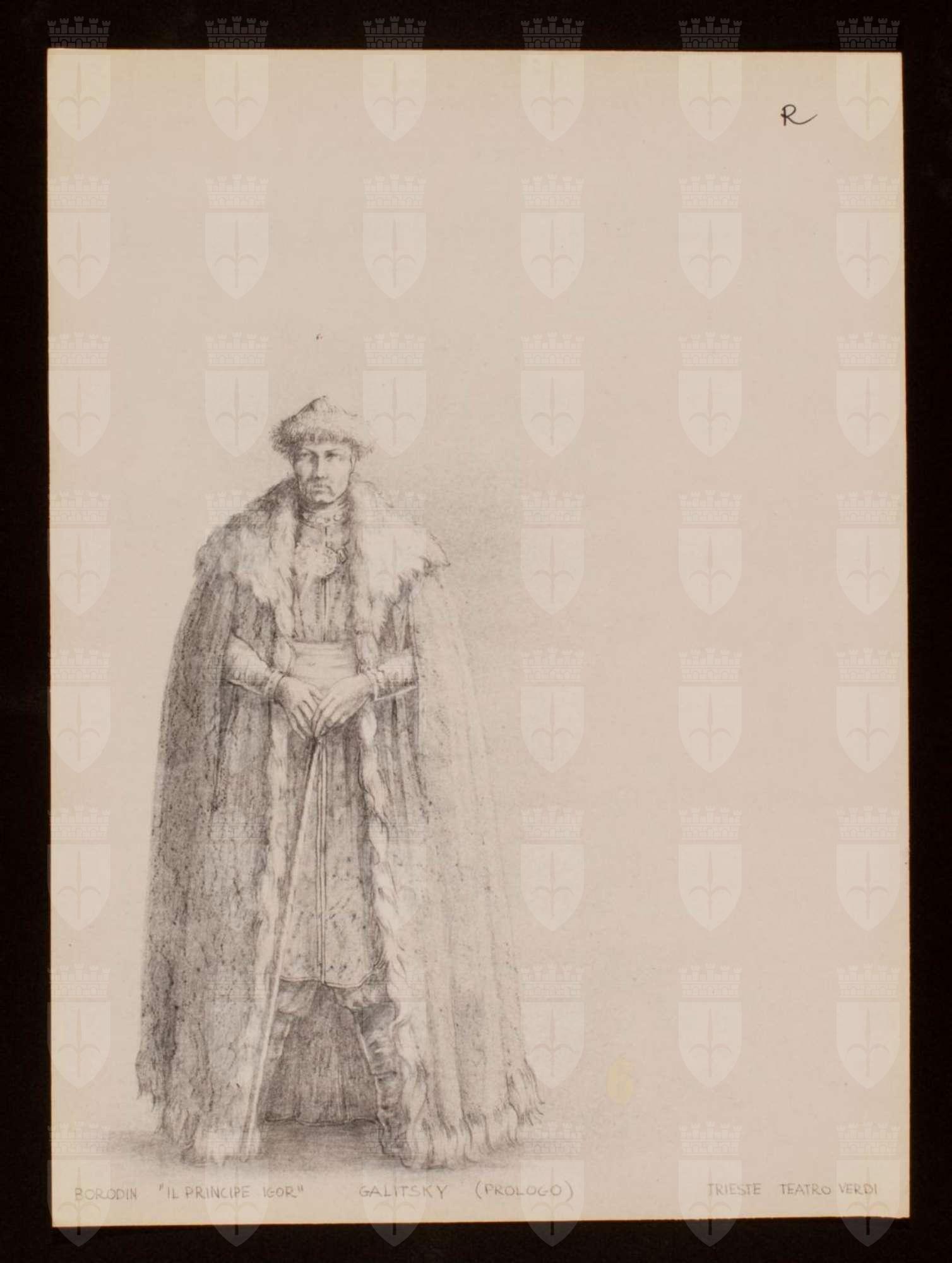 Il principe Igor, opera di Aleksandr Porfir'evič Borodin. Costume per Galitsky. Figura maschile intera, indossa: copricapo a calotta con bordatura in pelliccia, abito al ginocchio con applicazioni ornamentali, fascia in vita, pantalone largo al ginocchio, stivali, manto con collo e bordatura di pelliccia