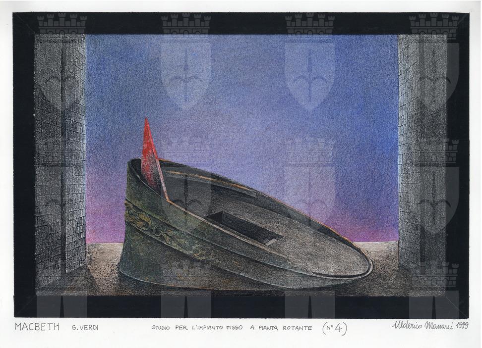 Macbeth, opera lirica di Giuseppe Verdi. Imponente impianto scenico a pavimento, in pendenza verso destra, a forma di corona circolare, senza punte, occupa tutto lo spazio scenico. Ai lati due mura alte con fessura centrale per il passaggio. Al centro della corona botola aperta, luce viola/ blu