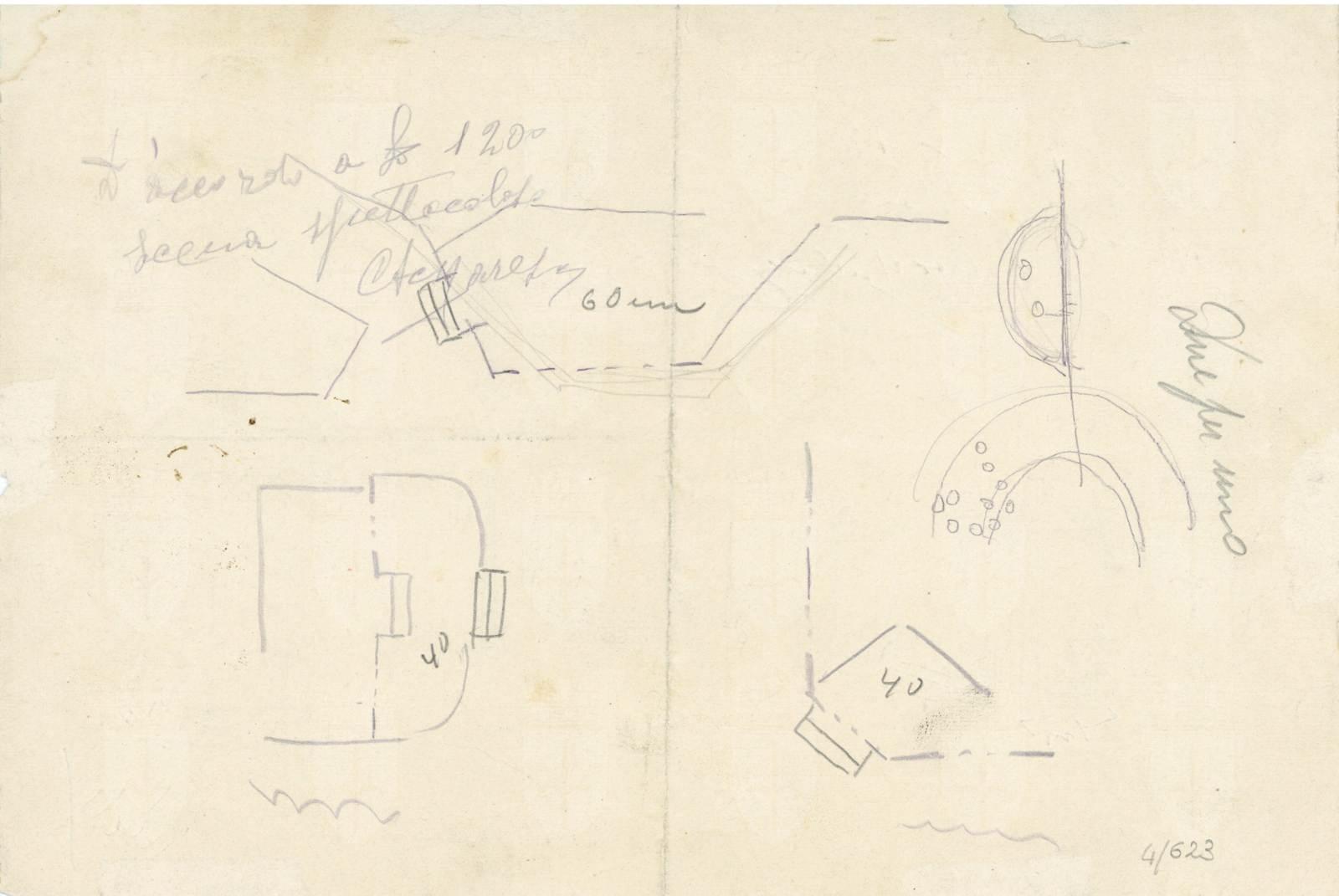 Bozzetto scenografico conservato con altro materiale iconografico relativo all'attività della famiglia Rossi, attiva nei laboratori scenografici del Teatro Verdi dal 1888-89. Nonostante la sigla sul recto e verso non sia attribuibile a Giacomo Rossi, presumibilmente il disegno fu fatto da lui