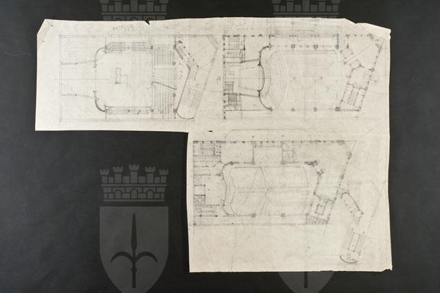 La tavola contiene tre planimetrie relative a diversi livelli di un cine-teatro parzialmente quotate. Calcoli matematici lungo il margine superiore.