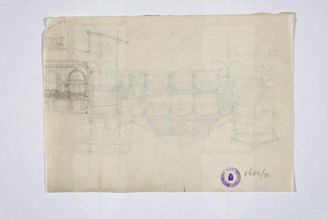 Disegno parzialmente quotato raffigurante spaccato di cine-teatro, sul recto; dettaglio dello stesso spaccato, sul verso.
