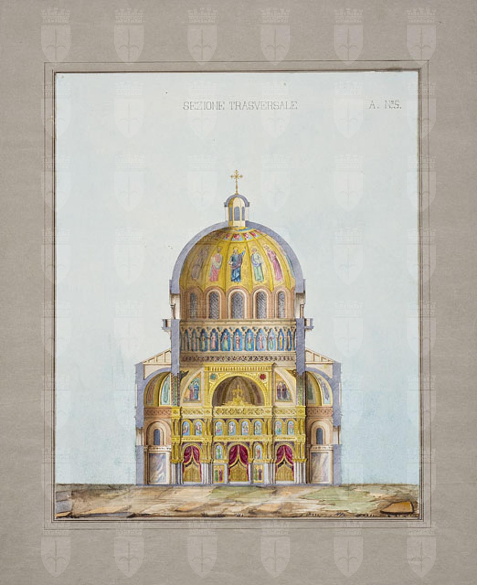 Entro passe-partout riquadrato, disegno ad acquerello, raffigurante la sezione trasversale di una chiesa di rito orientale con l'iconostasi e le sue decorazioni.