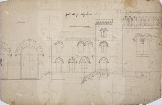 Disegno architettonico decurtato. Al centro è descritta la facciata principale di una villa in scala 1:50. A sinistra, è sviluppato il particolare delle finestre del primo livello; mentre a destra, dettaglio dell'alzato della torretta con bifora, pianta di quest'ultima, in scala 1:20. Sul verso, schizzo planimetrico.