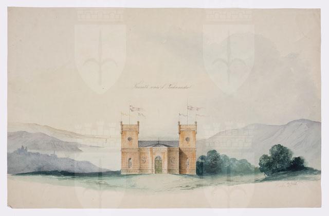 Disegno acquarellato raffigurante il prospetto di un edificio che domina un paesaggio con un golfo in lontananza. L'edificio, dal volume compatto, presenta due torri laterali che racchiudono un settore centrale lievemente avanzato, su cui si apre un portone ad arco. Fasce ornamentali con dettagli in pietra bianca segnano il basamento e la cimasa della parte aggettante; nicchie con statue e trofei di armi contribuiscono alla decorazione dell'edificio, trattato a conci lisci al piano terreno.