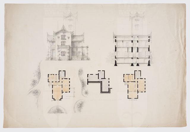 Si tratta di un progetto di villino, sviluppato anche in altre due tavole (cfr. CMSAOAR10_4141 e CMSAOAR10_4142), ove elementi di gusto Rundbogenstil sono accostati ecletticamente ad altri propri della casa rustica in legno. Acquistato per le civiche collezioni da Lituano Samero nel 1953, il disegno, sulla scorta di un'iscrizione vergata da mano ignota, è stato attribuito a Giovanni Andrea Berlam.