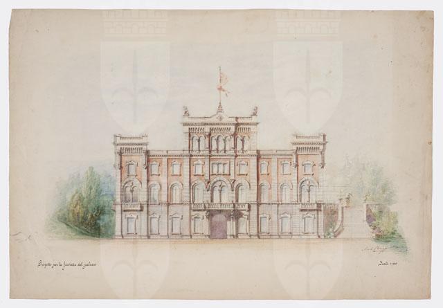 Disegno acquarellato per la facciata di un palazzo in scala 1:100, attorno è tratteggiato sommariamente un giardino.