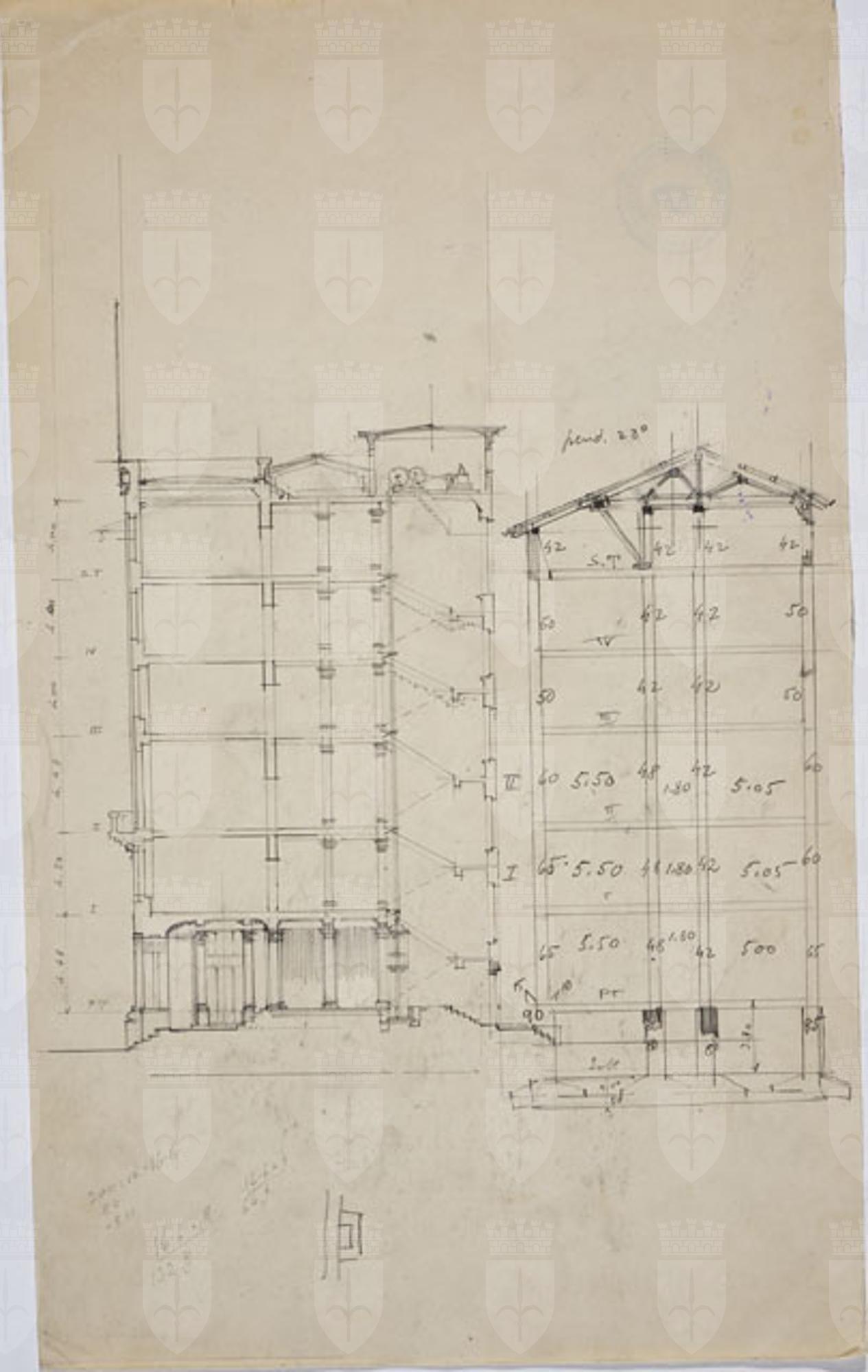 Disegno quotato a matita su carta. Sezione trasversale del corpo centrale di un edificio per l'Istituto Nazionale d'Assicurazione per gli Infortuni sul Lavoro, a sinistra; sezione trasversale di un corpo laterale del medesimo edificio a destra. In basso a sinistra, calcoli.