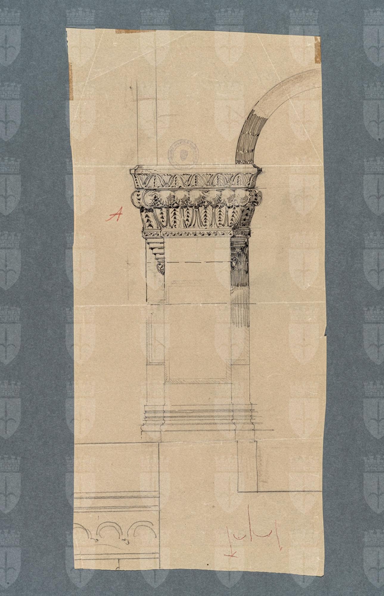 Tavola progettuale per la Sinagoga di Trieste, raffigurante il particolare di una lesena con capitello nella parte posteriore dell'edificio.
