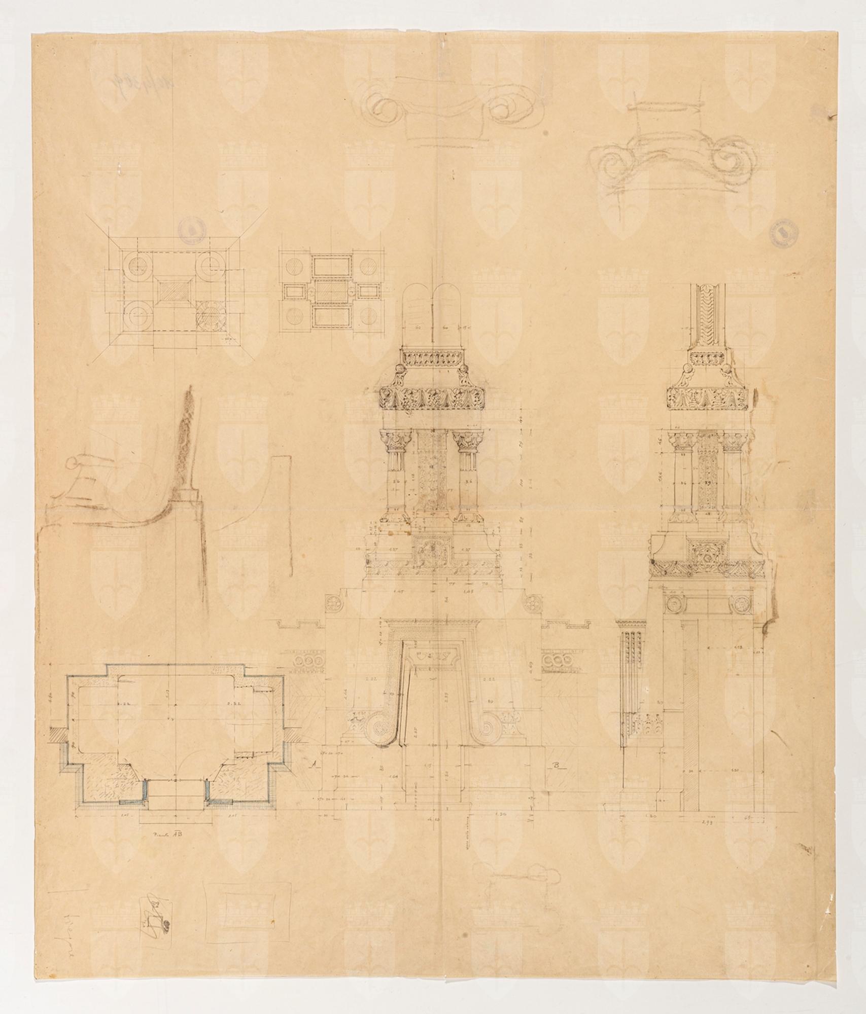 Il foglio presenta il disegno, gli schizzi e le varie piante dell'Armadio Sacro della Sinagoga di Trieste, con le indicazioni delle misure.