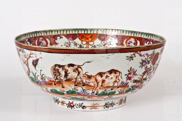 La coppa da punch è un tipico recipiente tra quelli creati in Cina per l’esportazione. Vi sono raffigurati, con prevalenza dei toni del rosso, una coppia di buoi e una coppia di cavalli in un paesaggio campestre connotato da farfalle e alberi fioriti di chiaro gusto cinese come la fascia con mascheroni che corre all’interno dell’orlo. Al centro dell’interno, mazzetto di roselline in stile Meissen. L’opera rientra nel legato di Anna Segrè Sartorio, costitutivo del Civico Museo Sartorio