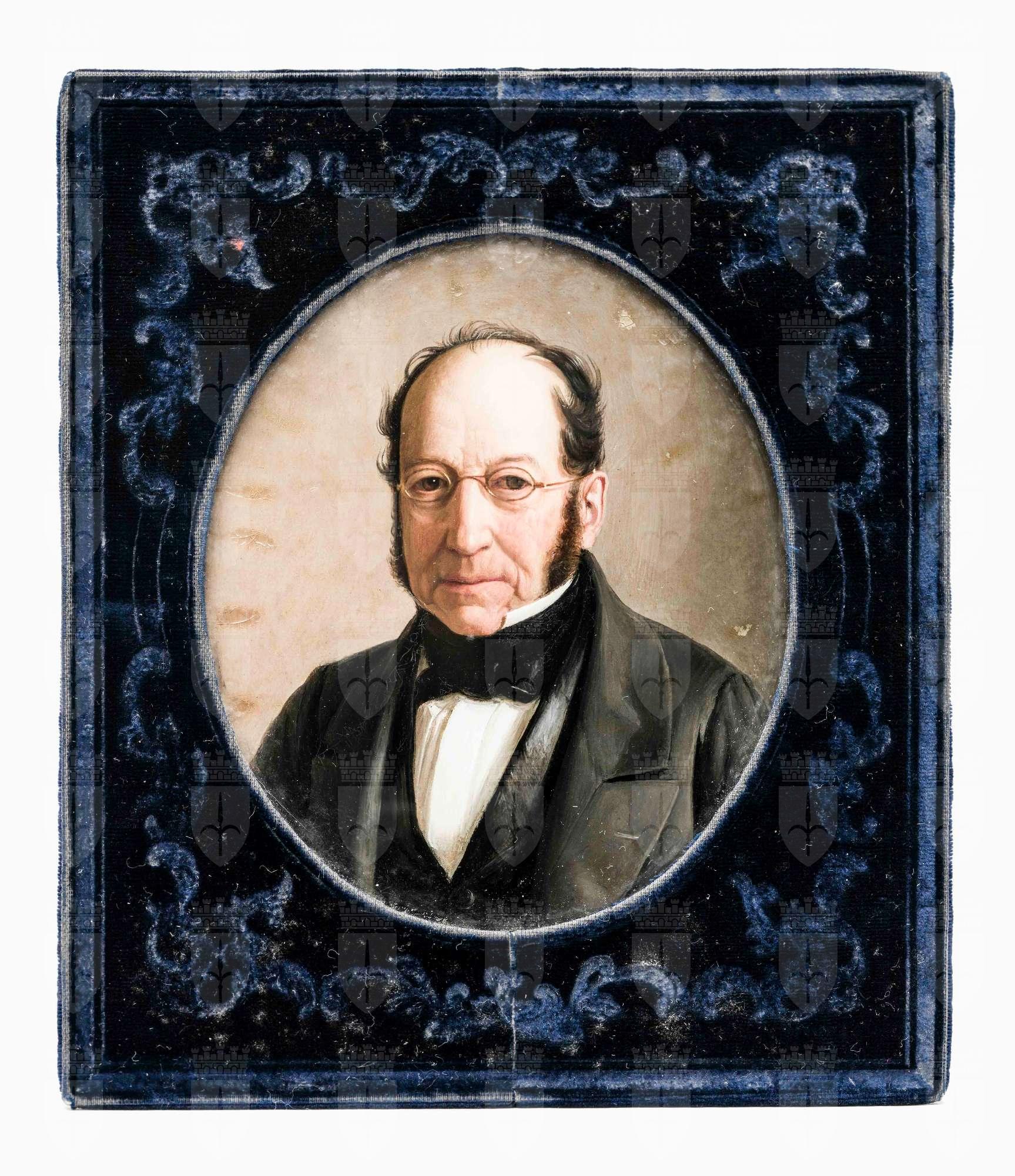 Si tratta del ritratto di Giovanni Guglielmo Sartorio (Trieste, 1789-1871), figlio di Brigida Borea d’Olmo e di Pietro Sartorio (Sanremo, 1754 - Fiume, 1820), un mercante di granaglie, che si era trasferito da Sanremo a Trieste nel 1775. Giovanni Guglielmo, formatosi a Klagenfurt e poi a Vienna, avviò la sua carriera presso la ditta del padre, ampliandone i commerci. Nel 1817 aprì una casa di commercio a Odessa, che in seguito venne diretta dal fratello Pietro. Il commercio lo porterà a raggiungere una posizione economica di spicco. Nel 1863 diede alle stampe le Memorie biografiche, in cui narra esperienze private e fatti pubblici, storie di uomini illustri da lui conosciuti e di continenti visitati. Nel 1869 venne nominato barone. La miniatura lo ritrae a mezzo busto, vestito con giacca, panciotto e cravatta neri. Una luce evidenzia le rughe più o meno profonde, che solcano il volto dell’anziano commerciante dallo sguardo acuto, ma stanco. Per un profilo più completo, si rinvia a Resciniti 2010, pp. 66-73. La miniatura può essere messa in relazione con il ritratto attribuito a Giovanni Pagliarini, cfr. CMSA inv. 5499, pressoché coevo.