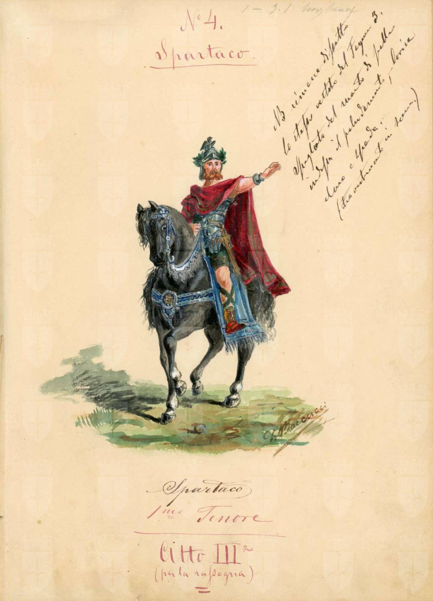 Spartaco, opera di Giuseppe Sinico. Figurino per il personaggio di Spartaco imperatore. Figura maschile intera a cavallo, braccio sinistro allungato verso l'esterno, mantello purpureo, aquila e alloro