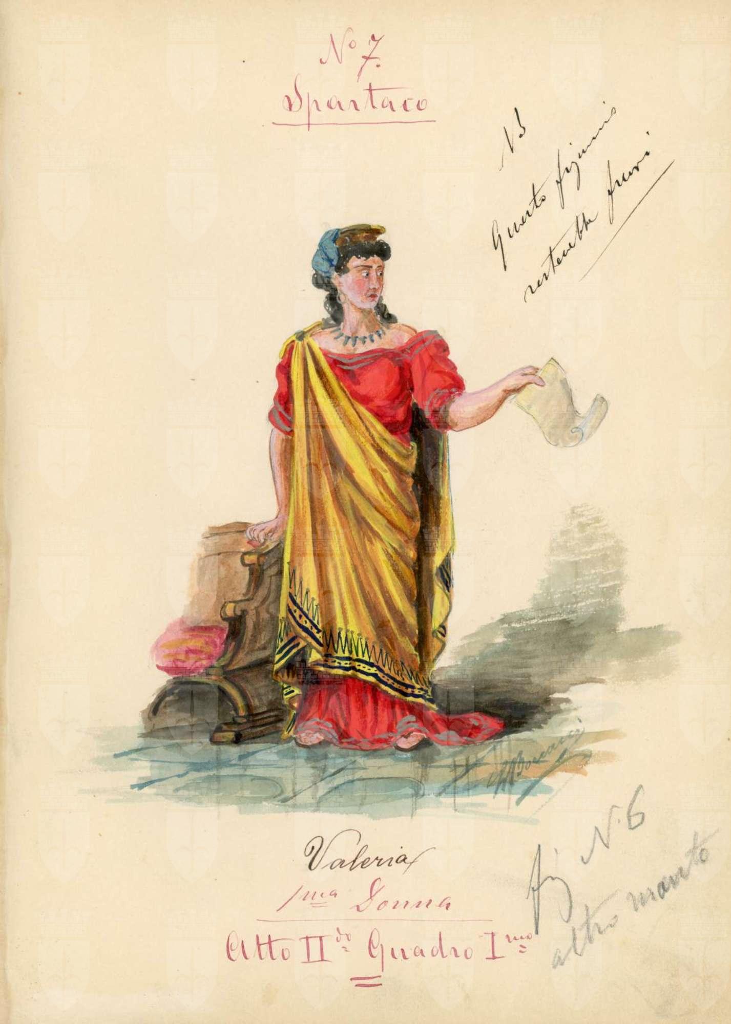 Spartaco, opera di Giuseppe Sinico. Figurino per il personaggio Valeria Messala. Figura femminile intera, appoggiata con una mano su un sedile posto alla sua destra. Tiene una pergamena aperta con la mano sinistra. Tunica lunga rossa, mantello giallo drappeggiato e decorato di nero sull'orlo, collana e copricapo azzurri.