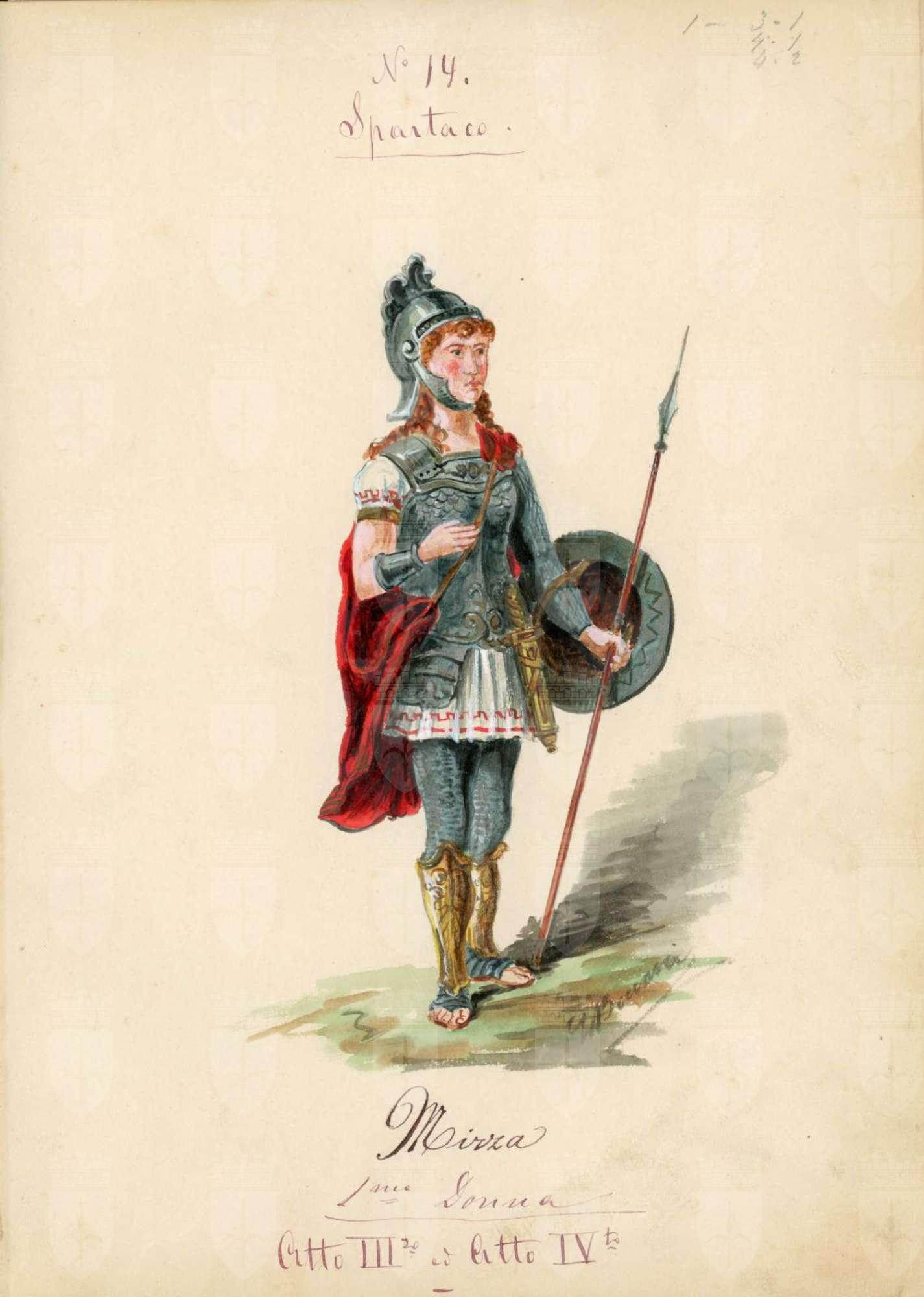 Spartaco, opera di Giuseppe Sinico. Figurino per il personaggio Mirza. Figura femminile intera di 3/4 in abiti militari maschili. Mantello rosso, elmo, lancia, scudo, corazza corta