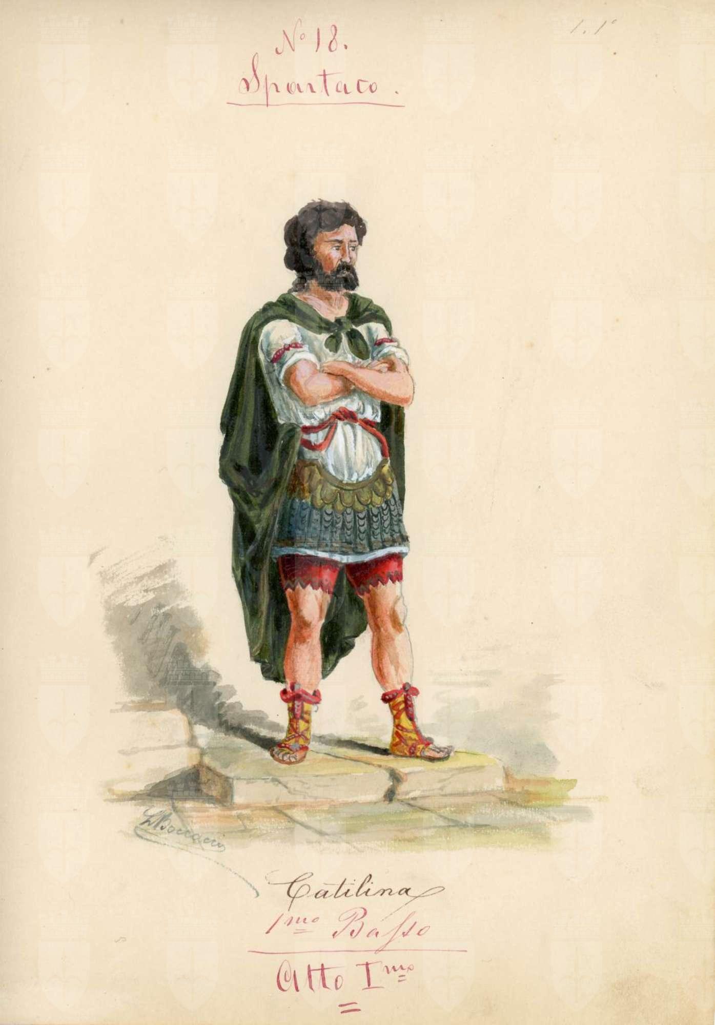 Spartaco, opera di Giuseppe Sinico. Figurino per il personaggio Catilina. Figura maschile intera con le braccia conserte, tunica bianca, armatura tipo "cingulum" pende dalla vita, Calzoni sopra il ginocchio, mantello, sandali