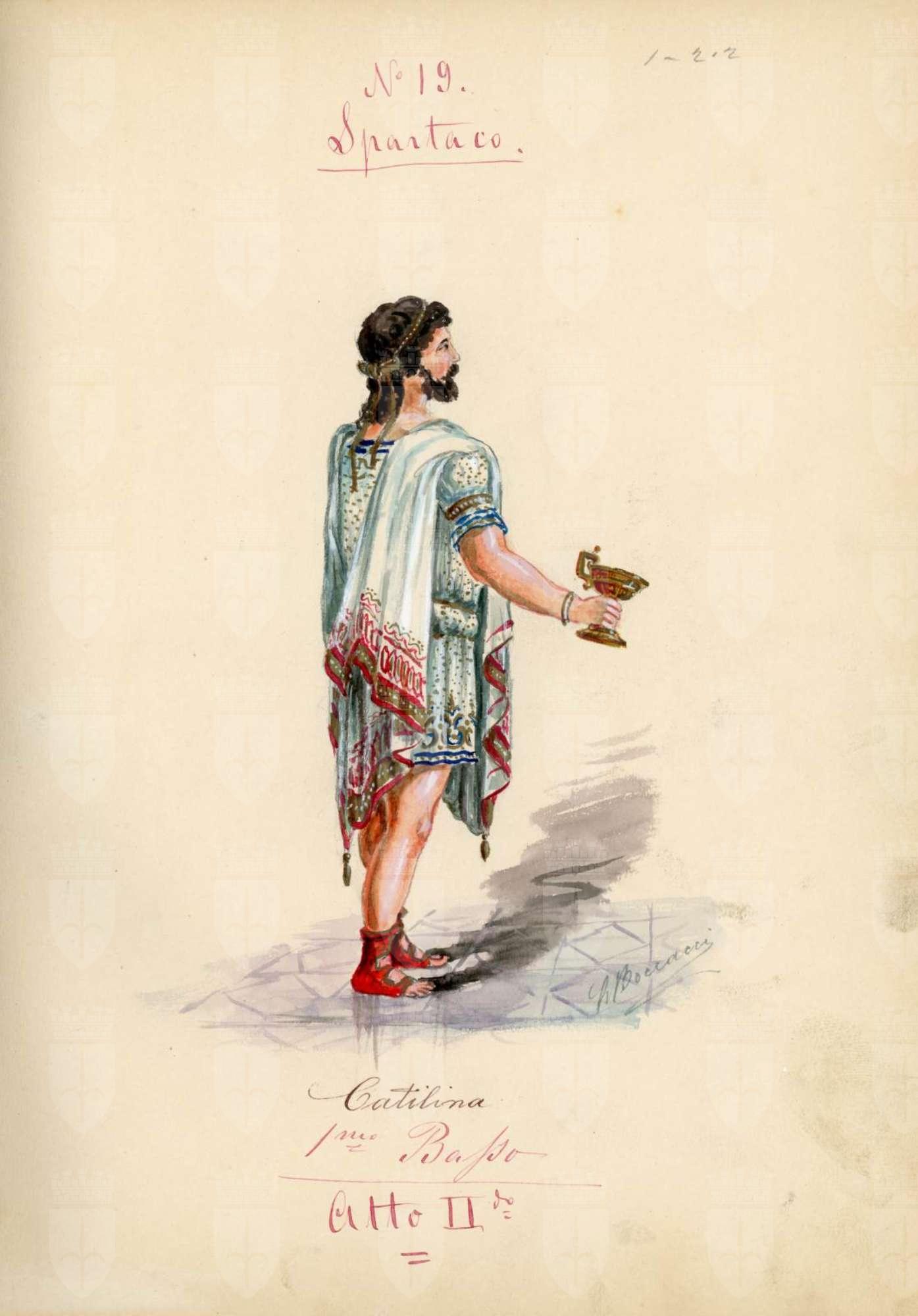 Spartaco, opera di Giuseppe Sinico. Figurino per il personaggio Catilina. Figura maschile intera di 3/4 di schiena. Tunica bianca corta con disegni oro e blu, mantello bianco con orlo decorato, sandali. Regge una coppa con la mano destra