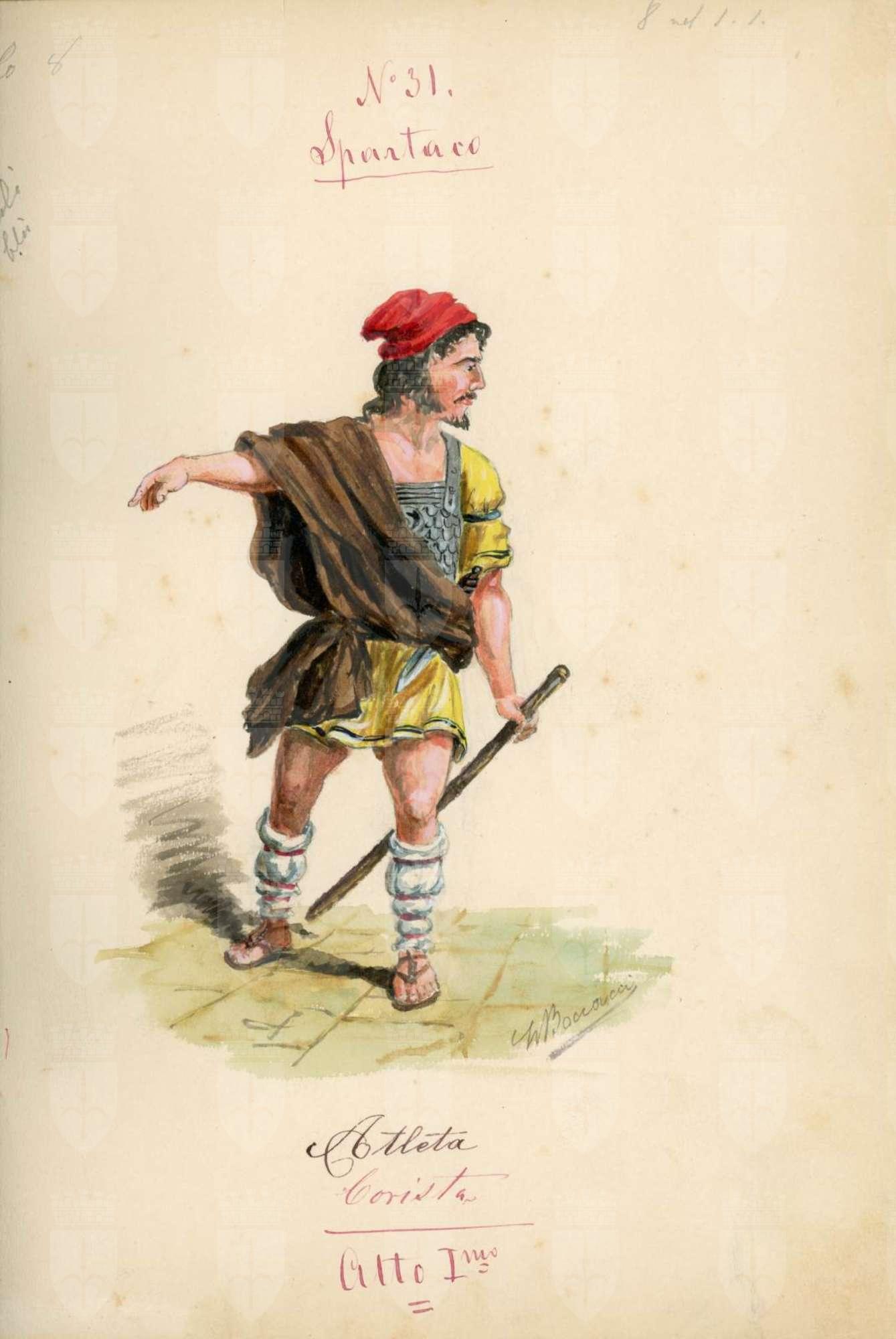 Spartaco, opera di Giuseppe Sinico. Figurino per il personaggio di un atleta. Figura maschile intera con volto di profilo e braccio destro alzato verso l'esterno. Corta tunica gialla, corazza a squame corta in vita, mantello marrone, berretto frigio roso, bastone nella mano sinistra