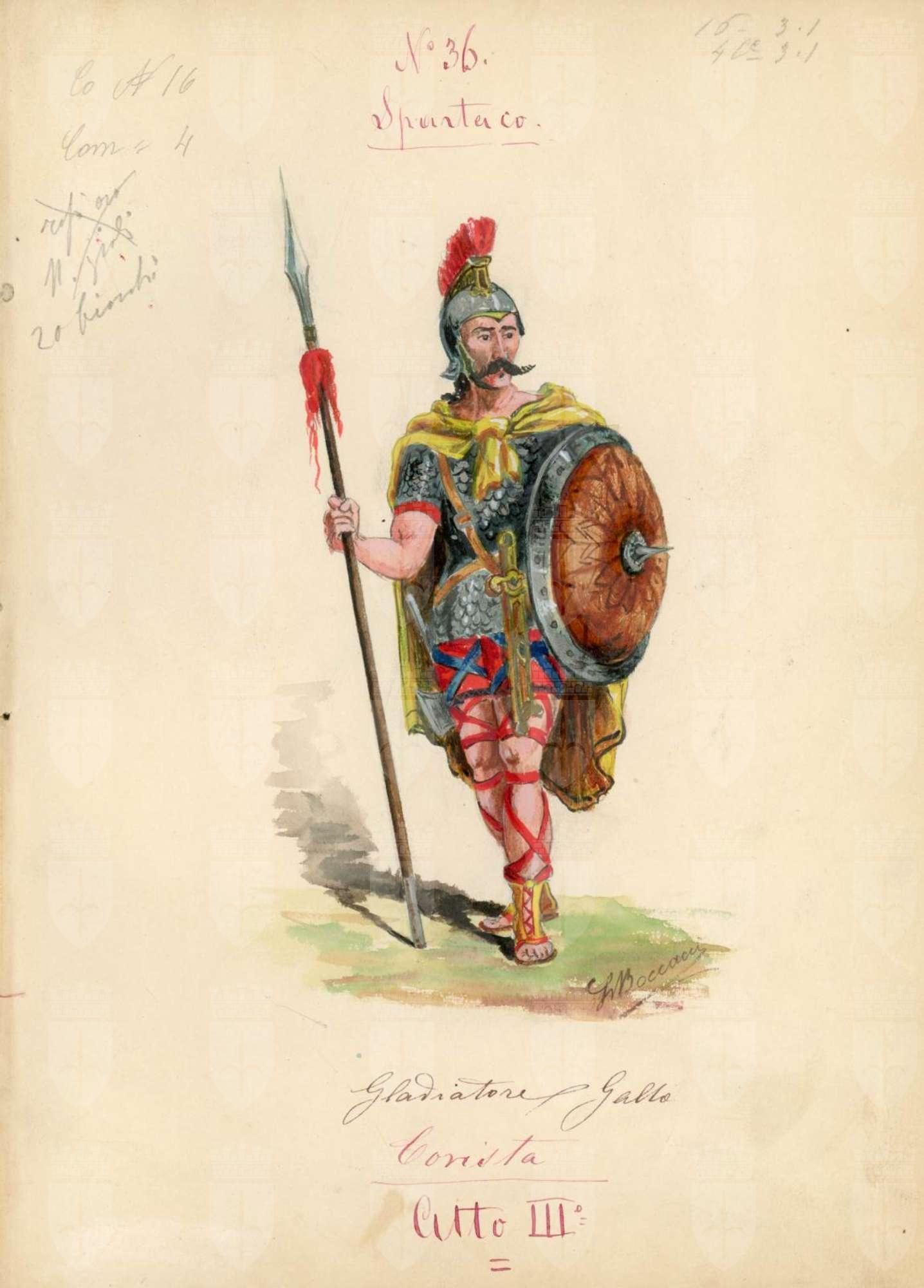 Spartaco, opera di Giuseppe Sinico. Figurino per il personaggio di un gladiatore gallo. Figura maschile intera, regge con la mano destra una lancia appoggiata a terra e con la sinistra lo scudo. Corazza a squame, calzoni corti, gambe con fasce, sandali, mantello giallo, elmo sul capo