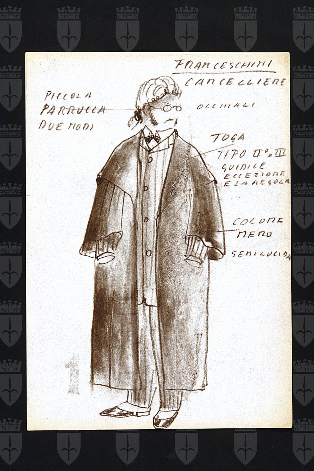 Motivo di scandalo e di riflessione, due tempi di John Osborne. Il cancelliere, figura intera maschile con parrucca e occhiali, toga aperta, giacca e calzoni rigati