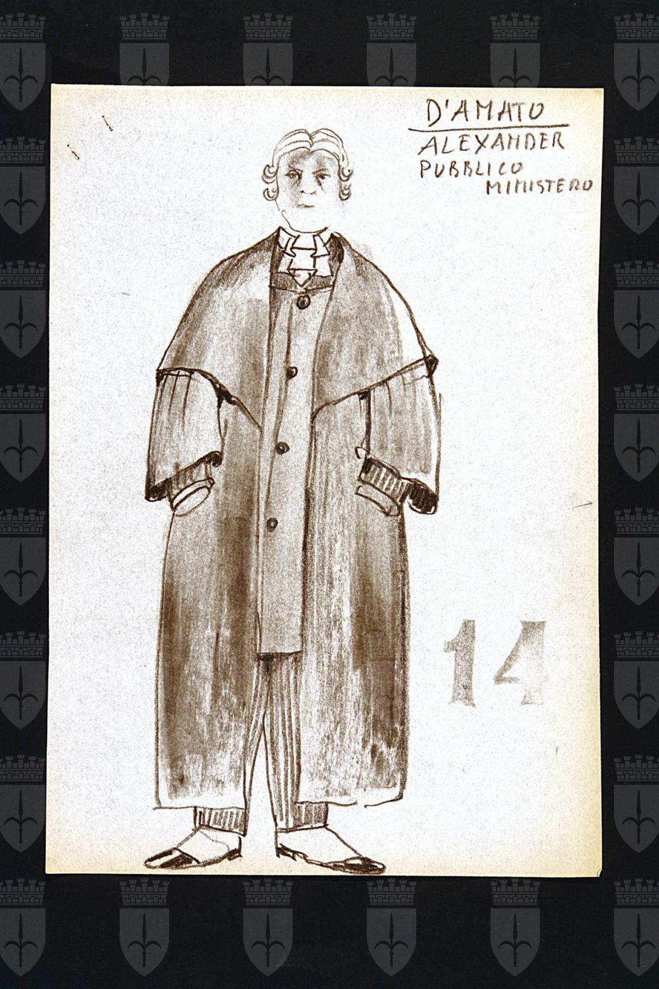 Motivo di scandalo e di riflessione, due tempi di John Osborne. Alexander, pubblico ministero, figura maschile intera con toga completa di parrucca e jabot, giacca lunga, calzoni rigati e ghette.