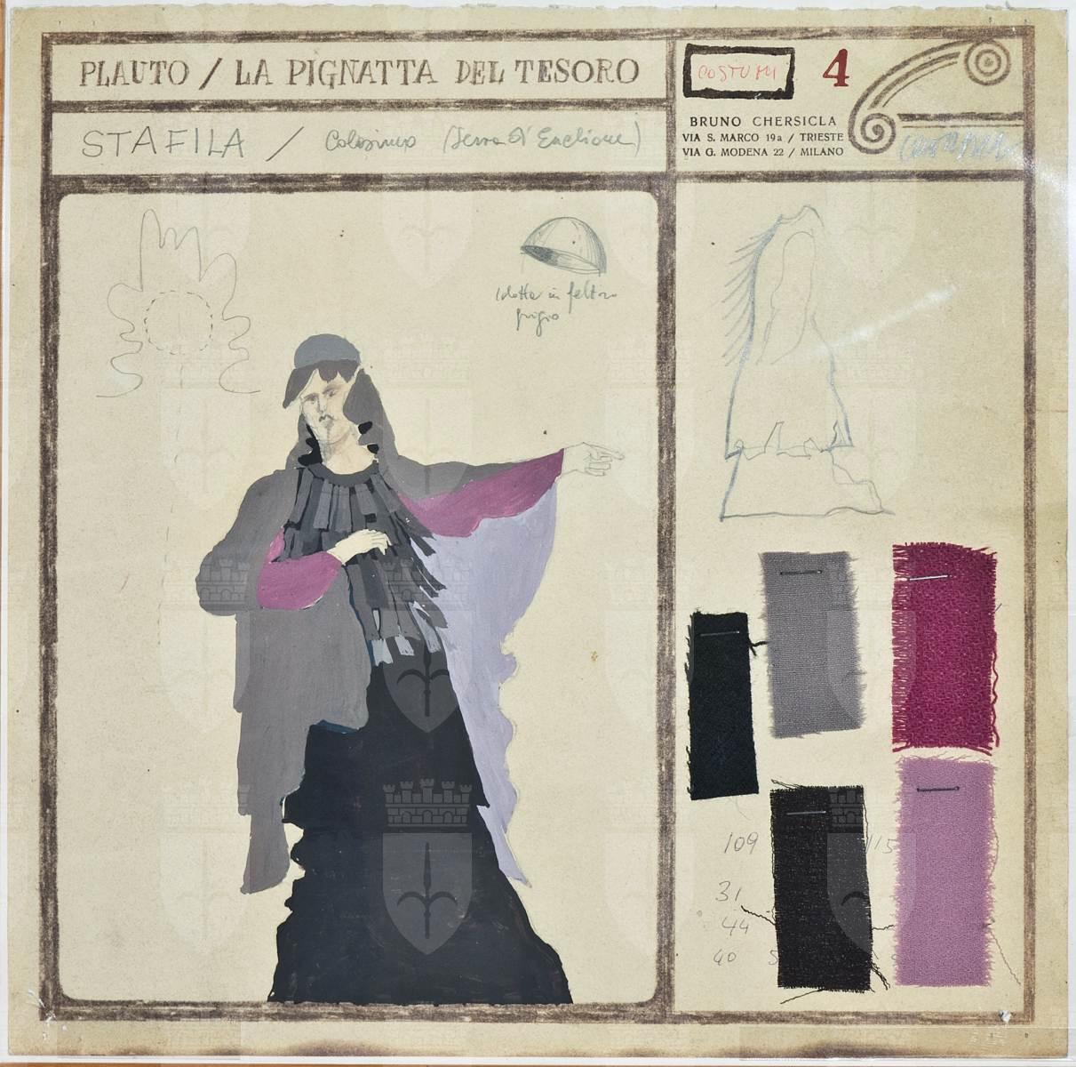 Figurino per Aulularia (La pignatta), testo teatrale di Tito Maccio Plauto (elaborazione di Lino Carpinteri e Mariano Faraguna), regia Ugo Amodeo, Teatro Auditorium e Teatro Romano dal 1 al 28 giugno 1966
