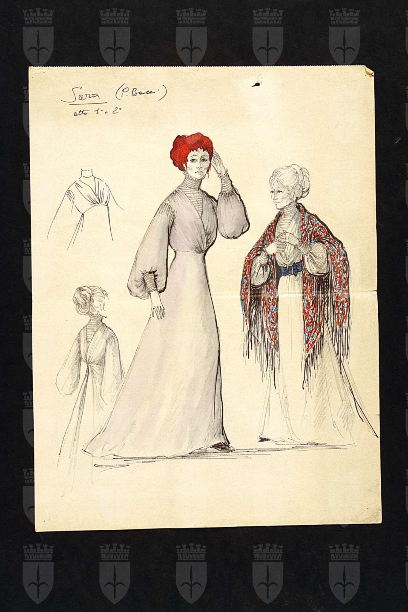 Ivanov, testo teatrale di Anton Cechov. Personaggio: Sara. Due figure femminili intere con abito stile impero. A sinistra particolari dell'abito, scollo anteriore e posteriore e della pettinatura. A sinistra abito lungo grigio corto a strascico, ampie maniche a sbuffo strette ai polsi e corpetto a scollatura sovrapposta, camicia a collo alto. A destar abito simile con cintura blu e scialle frangiato variopinto