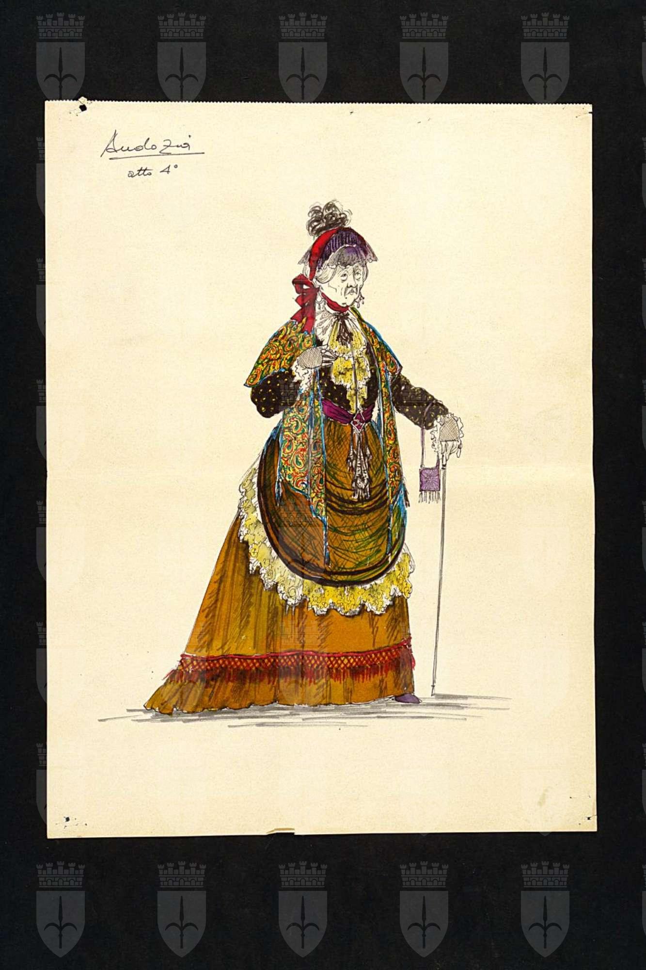 Ivanov, testo teatrale di Anton Cechov. Personaggio: Audotja. Figura femminile intera raffigurante donna in età avanzata. Gonna lunga, grembiule, scialle a disegni, jabot, bastone, borsetta, numerosi accessori