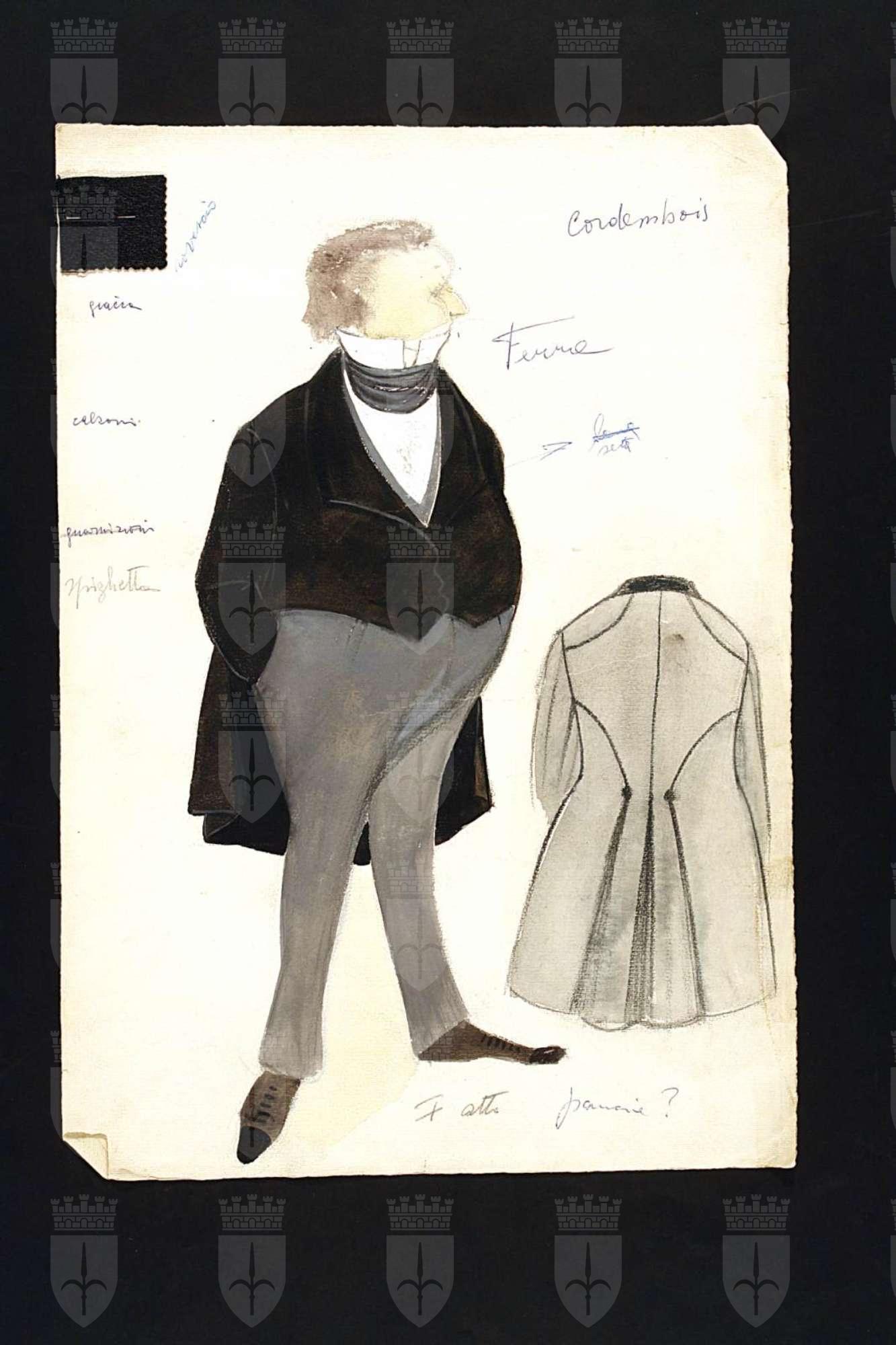 La cagnotte, testo teatrale di Eugène Labiche. Figurino per Cordenbois. Figura maschile intera di 3/4. Giacca nera, calzoni e gilet grigi, camicia alta e collo alto chiusi da foulard grigio. A destra in basso studio del retro della giacca