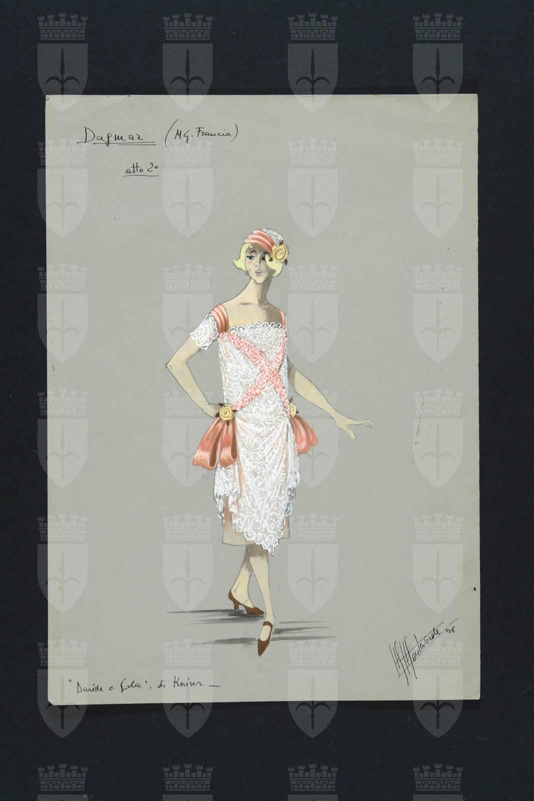 Davide e Golia, opera di Georg Kaiser. Disegno per figurino per il personaggio di Dagmar. Figura femminile, volto ruotato a destra, corso a sinistra. Abito a tubino beige con sopravveste in pizzo bianco trattenuta ai fianchi. Spalline in seta rosa, fasce rosa in seta intrecciate dalle spalle ai fianchi con rose gialle applicate sui fiocchi. In testa zucchetto in pizzo bianco con fasce in tessuto rosa e fiore in stoffa gialla. Scarpe décolleté a punta con cinturino alla caviglia