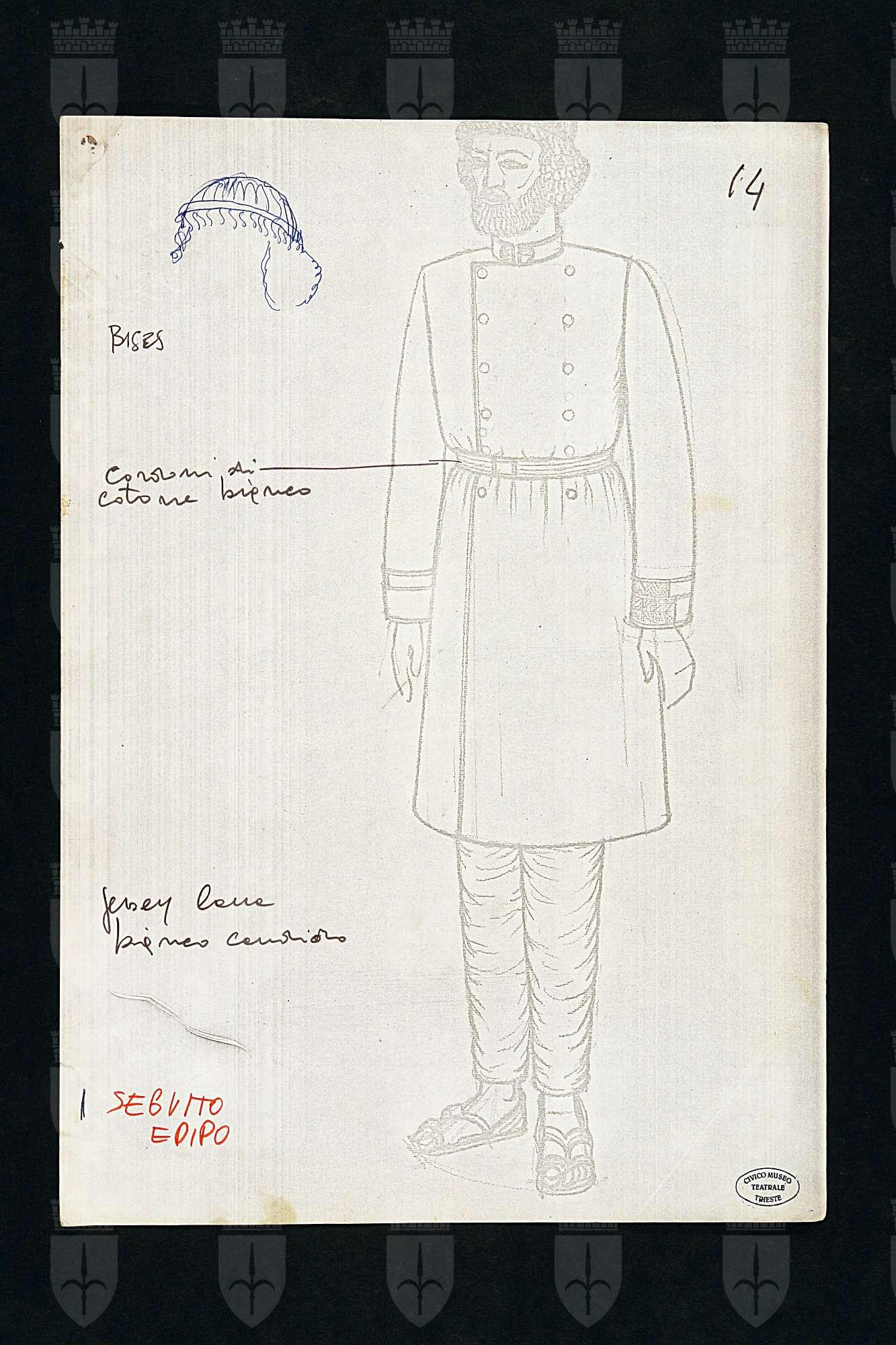Edipo Re di Sofocle, costume per Edipo, Abito doppiopetto lungo al ginocchio, collo a giro, doppia fila di bottoni, cintura con fibbia. Decorazioni geometriche ai polsi e collo, copricapo a calotta, pantaloni alla caviglia, sandali