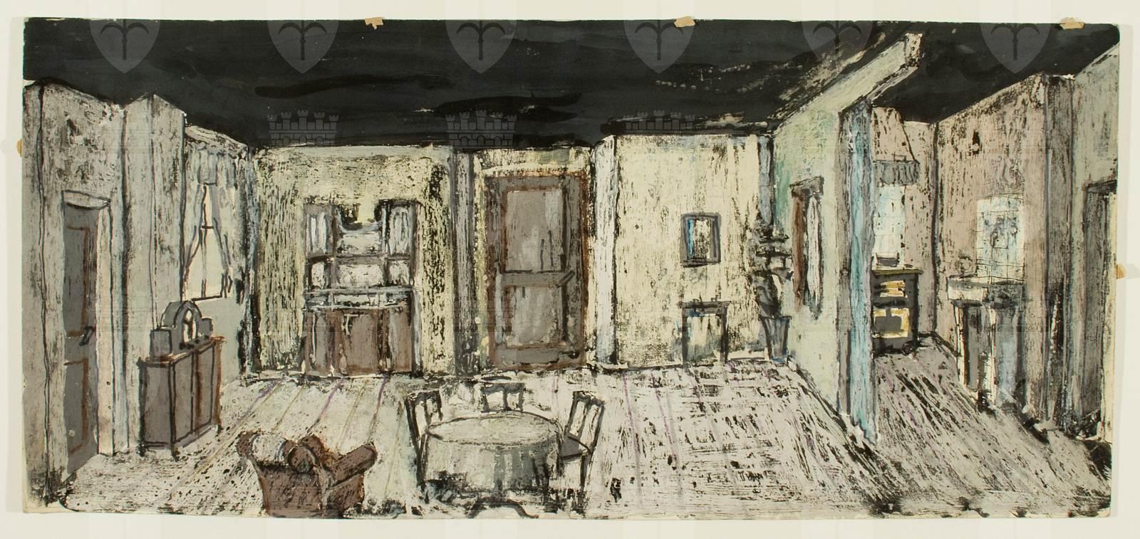 Una domenica, opera di Mario Bugamelli, atto unico. Casa popolare, interno; spaccato di sala da pranzo e cucinino con mobilia povere
