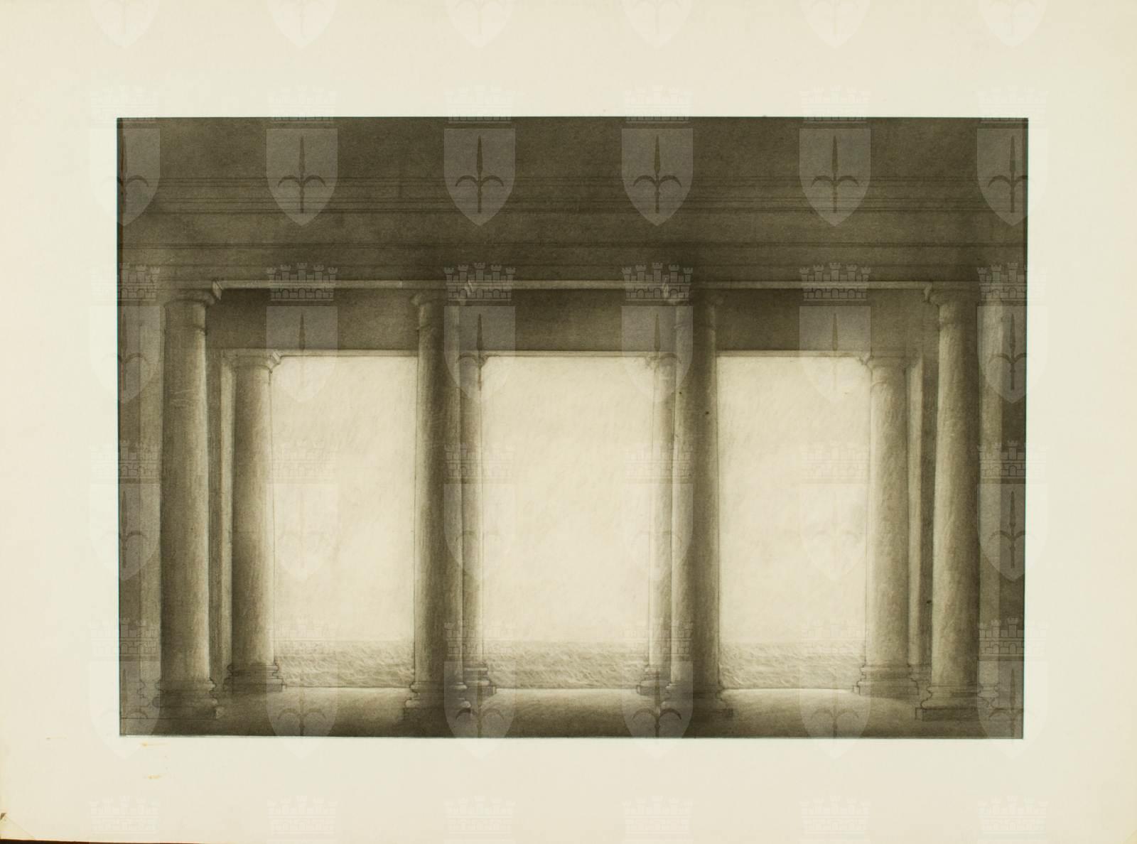 Otello, opera di Giuseppe Verdi, atto 2., castello. Interno con sala con 8 colonne di ordine toscano e trabeazione