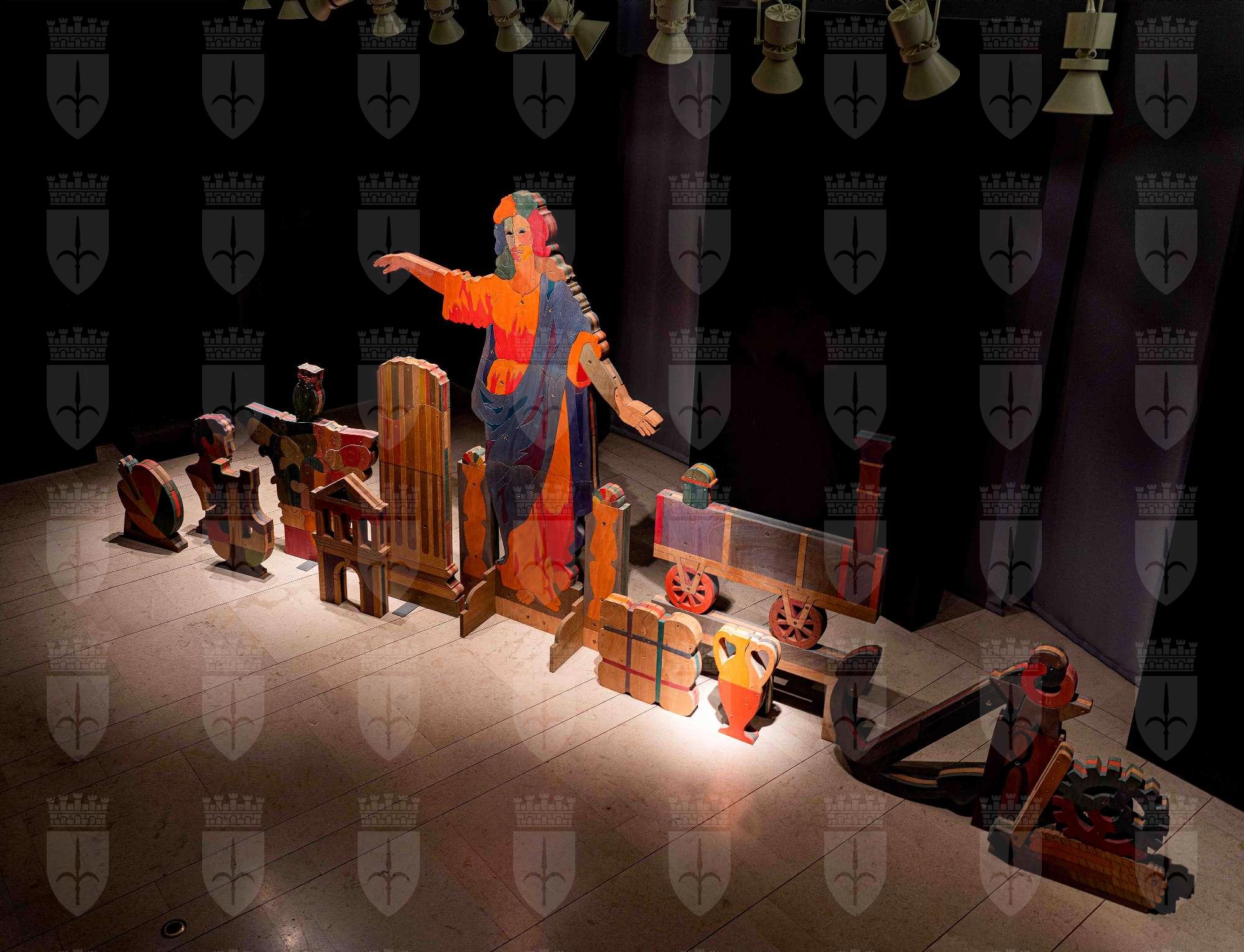 «Alla Conciergerie sono esposte cinque mie opere, della specie di inserti di tipo teatrale che rappresentano alcune caratteristiche della città: la prima è una trascizione del fastigio scultoreo di un palazzo in Piazza Unità d’Italia, riprodotto nelle dimensioni reali m. 7,50 x 2,60. Il fatto spettacolare è che, oltre alle possibilità scompositive del pezzo gli elementi in pietra vengono tradotti in legno e quindi la plasticità diviene illusoria: inoltre le proporzioni si modificano e vengono esaltate dal momento che la visione ottica si sposta dall’alto al basso e l’apporto del colore risulta accattivante per il visitatore». Con queste parole Bruno Chersicla descriveva nel 1985 il Fastigio di Palazzo Stratti, realizzato per la mostra di Parigi organizzata in quello stesso anno e dedicata alla città di Trieste. L’imponente opera è stata donata dall’artista al Museo Revoltella ed esposta nella stessa sede museale in occasione di una grande mostra antologica allestita tra il 1997 e il 1998. Si tratta di una reinterpretazione attraverso un linguaggio moderno di una parte di uno degli edifici più interessanti e noti della città, Palazzo Stratti, sito in Piazza Unità d’Italia. Costruito in stile neoclassico nel 1839 dall'architetto Antonio Buttazzoni per volere di Nicolò Stratti, fu poi acquistato dalle Assicurazioni Generali. In cima al corpo centrale fu collocato un gruppo scultoreo allegorico raffigurante al centro Trieste, sotto sembianza di donna, circondata dalla Fortuna e dal Progresso. A destra di chi guarda la facciata, a sinistra quindi della donna, fu collocata una locomotiva - come auspicio per la realizzazione di una linea ferroviaria che collegasse Trieste e Vienna -, e insieme a essa una ruota dentata, un'ancora, una pinza, l'incudine ed il martello dovettero simboleggiare il lavoro industriale. Sul lato opposto, invece, sono raffigurati una colonna e un capitello con una civetta, simbolo della ragione e delle tenebre, che simboleggiano lo sviluppo architettonico della città, una cetra che simboleggia la musica, un busto che rappresenta la scultura, una tavolozza la pittura e tutte assieme simboleggiavano la crescita culturale ed industriale di Trieste.