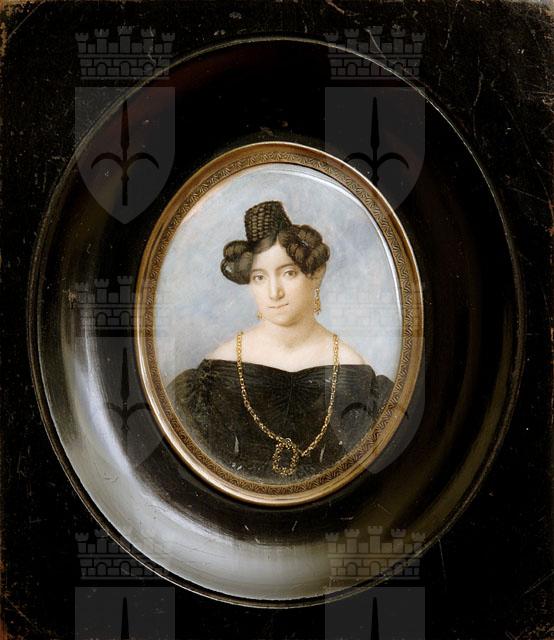 Ovale con ritratto femminile a mezzo busto. La donna raffigurata en face veste un abito di velluto scuro con ampia scollatura ovale, corpetto attillato, reso tale dall'utilizzo del busto, stretto all'altezza della vita da una cintura in tinta con l'abito e dotata di una fibbia dorata. Attorno al collo la donna porta una preziosa collana, mentre ai lobi vi sono degli orecchini; acconciatura a giraffa.