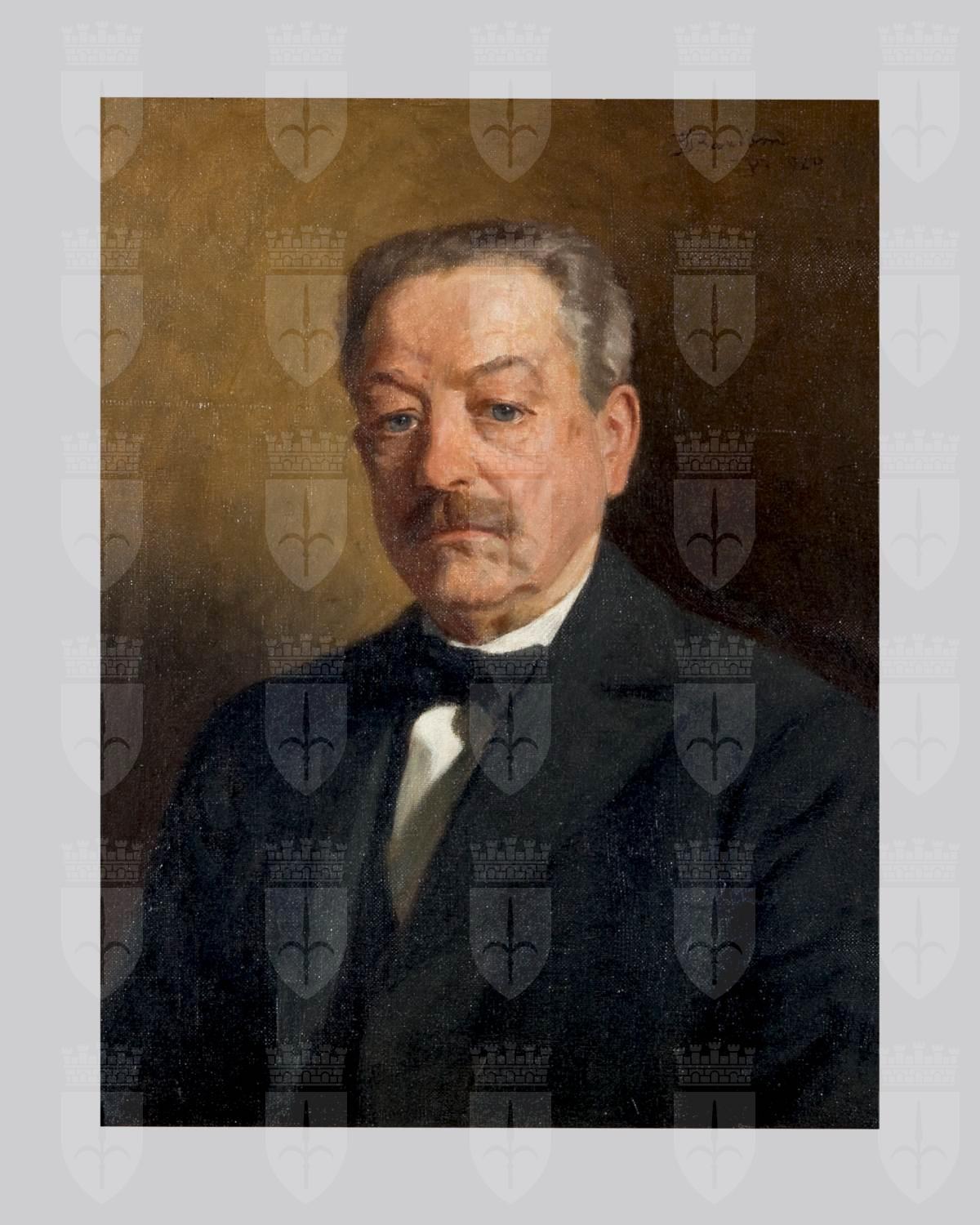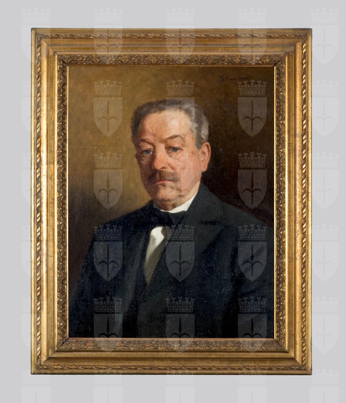Carlo Schmidl ritratto a mezzobusto di fronte leggermente ruotato a destra. Indossa giacca pesante nera, panciotto, camicia bianca e papillon nero. Porta lunghi baffi.