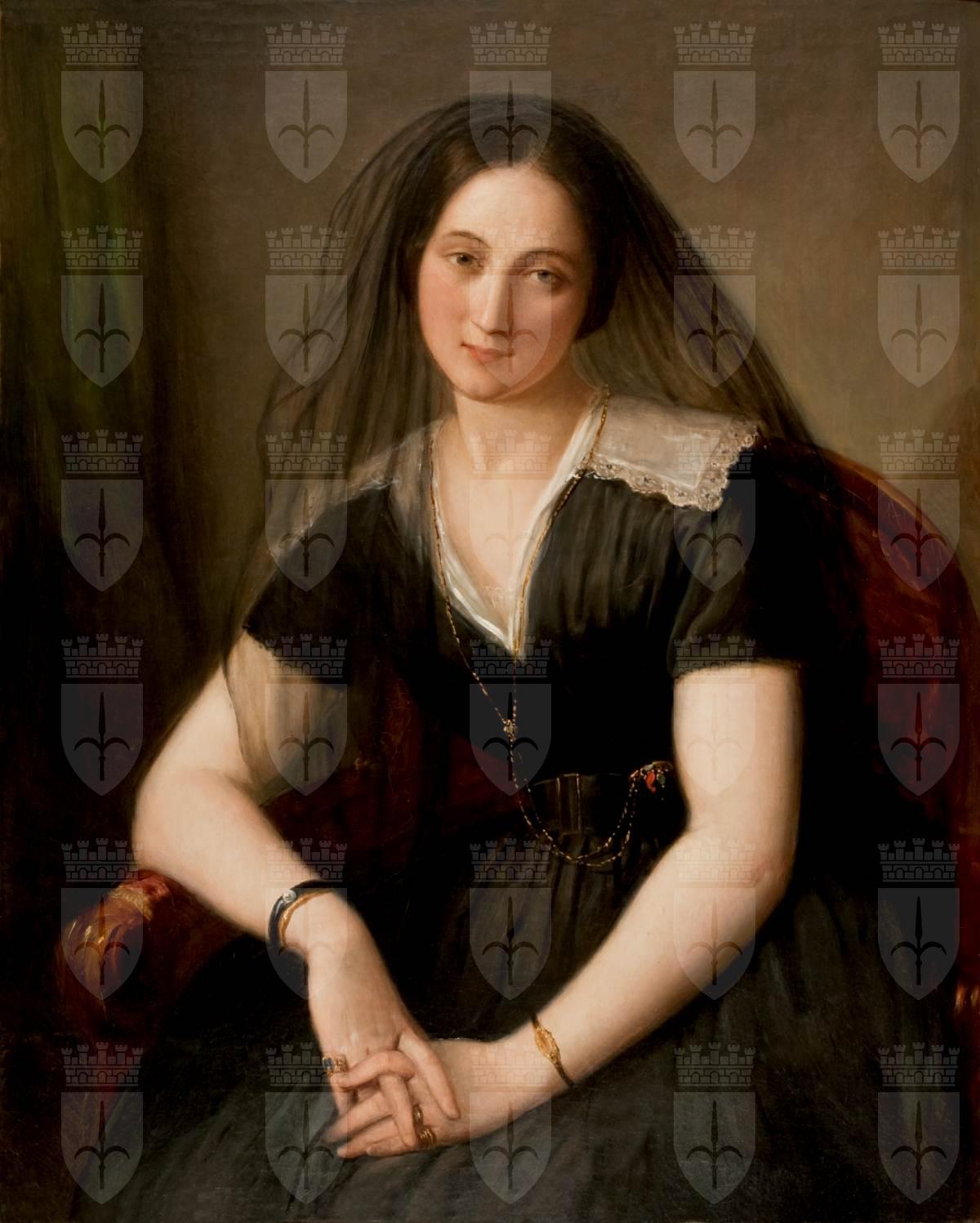 Ritratto di Adelaide RIstori, qui ritratta in giovane età con un velo nero che le copre la testa arrivando fino al busto. Una cintura con grossa fibbia sistemata sull'abito ne evidenzia il punto vita. A sottolineare la scollatura del vestito una catenina d'oro e pietre colorate, con saliscendi, alla quale è legata probabilmente un paio di occhialini. La donna indossa numerosi altri gioielli: tre bracciali e vari anelli d'oro, forse per rimarcare il nuovo status sociale acquisito. La posa acquisita dall'attrice in questo ritratto è in parte malinconico e al tempo stesso languido.