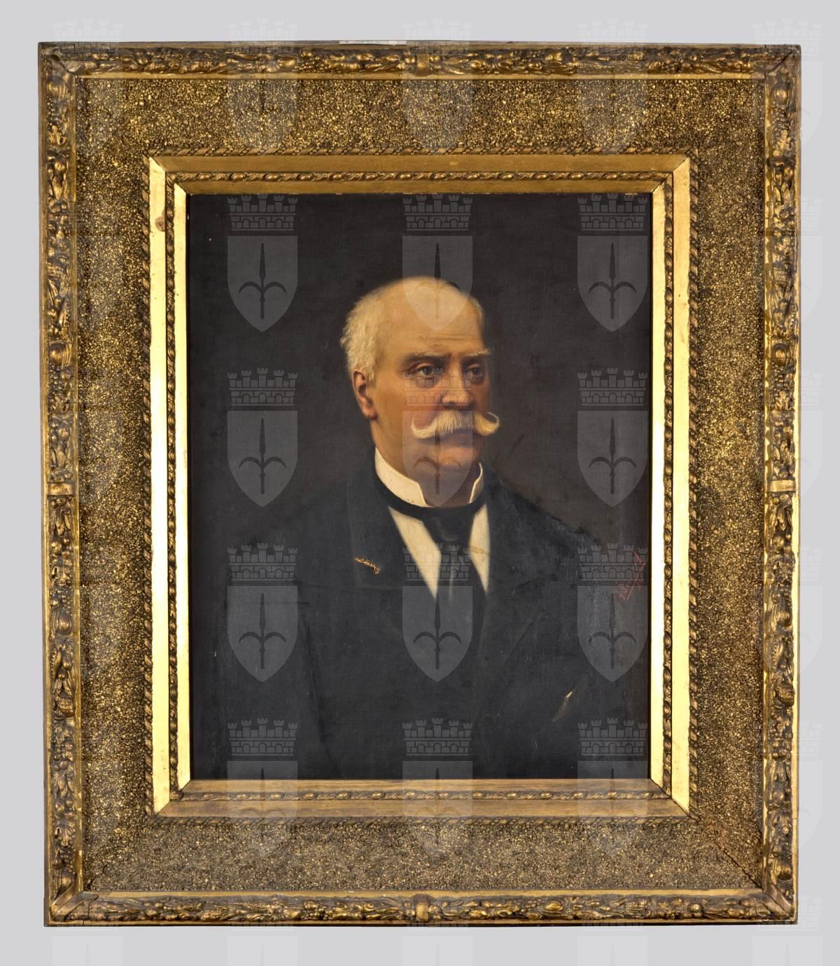 Ritratto di Edoardo Borghi ripreso a mezzobusto di fronte, leggermente ruotato verso destra. Il commerciante viene ritratto in età avanzata, porta capelli e baffi bianchi. Indossa: camicia bianca con colletto alto, cravatta nera al collo, giacca nera abbottonata