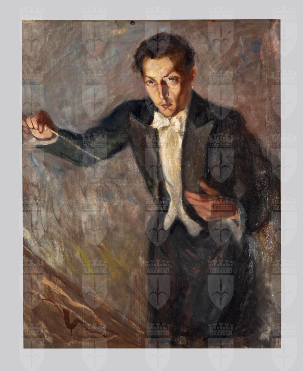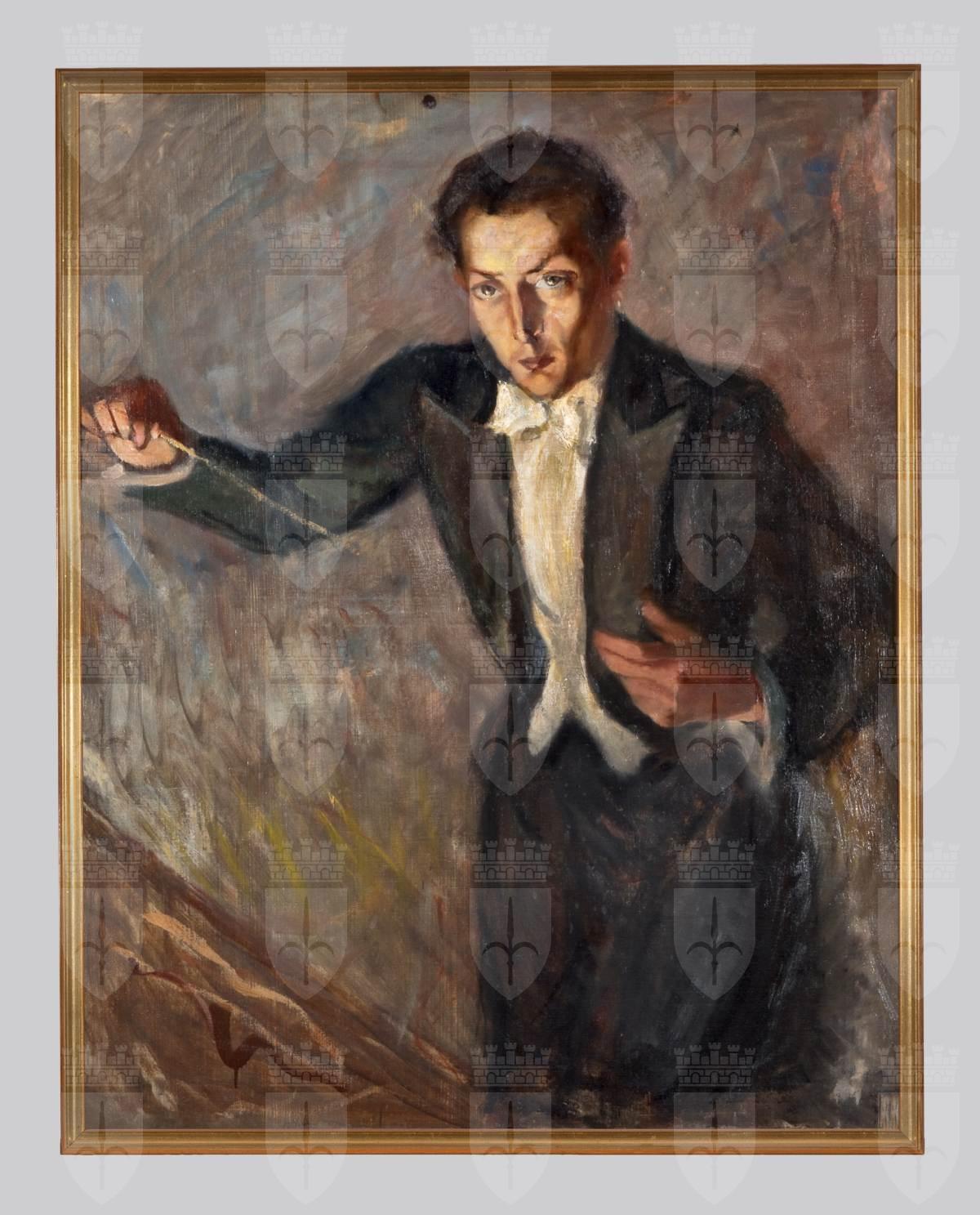 Nel dipinto vediamo il giovane compositore, colto di tre quarti nell'atto di dirigere un'orchestra. Il volto appare ben illuminato e concentrato nella direzione. Come da consuetudine il Maestro indossa un abito nero a code con camicia e farfallino bianco e tiene nella sua mano destra la bacchetta.