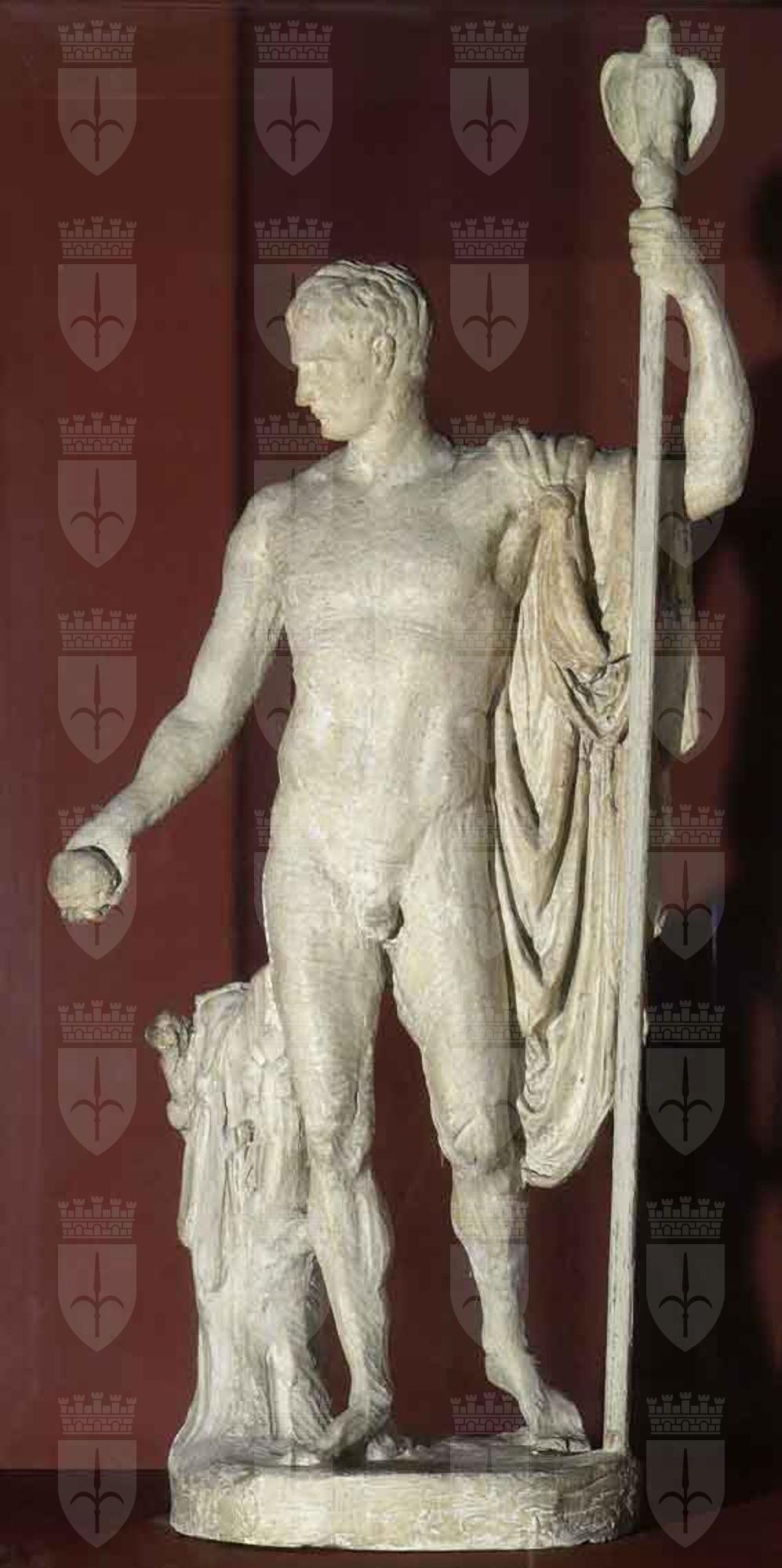Il gesso è probabilmente un calco, ricavato da Canova stesso, del modellino in terracotta originale, oggi non più reperibile, per la statua colossale di Napoleone come Marte pacificatore, scolpita da Canova prima in marmo (1803-1806, Londra, Apsley House), quindi fusa in bronzo (1809, Milano, Brera). L’opera originale in marmo, alta quasi tre metri e mezzo, fu eseguita tra il 1803 e il 1806, in seguito alla commissione di un ritratto da parte dell’imperatore (1802). Secondo il Cicognara, Canova trasse ispirazione da un atleta ellenistico degli Uffizi, ma non è da escludersi un richiamo all’imperatore Augusto, portatore di pace dopo una fase di guerre civili. Il modellino potrebbe essere stato eseguito tra il 1802 e il 1803, dato che il modello grande fu esposto nello studio nel luglio 1803. Quando la statua fu portata a Parigi nel 1811, Napoleone, che non gradiva di essere raffigurato ignudo, decise di non consentirne l’esposizione al pubblico e di depositarlo nei magazzini del Louvre. Il marmo fu acquistato dal governo inglese nel 1815 e poi donato a Lord Wellington, il vincitore di Waterloo, che lo collocò nella sua casa di Londra. La versione in bronzo fu commissionata a Canova nel 1807 dal viceré d’Italia Eugenio e giunse a Milano nel 1812. Dopo varie vicissitudini nel 1859 trovò collocazione nel cortile dell’Accademia di Belle Arti. Il bozzetto in gesso del Revoltella fu ceduto al Museo dagli eredi dell’architetto Pietro Nobile, al quale era passato in proprietà dal barone Angelo Calafati, nominato nel 1813 intendente di Trieste e dell’Istria. Già nell’Ottocento sul gesso venne steso uno strato di pittura color avorio con lo scopo di fare assumere al modellino l’aspetto del marmo e di nascondere le tracce di colore rossastro lasciate dalla terracotta sulla quale era stato eseguito il calco. Anche l’esecuzione di una riproduzione in bronzo (pure nelle collezioni del Museo Revoltella) ha compromesso senz’altro la conservazione del pezzo.