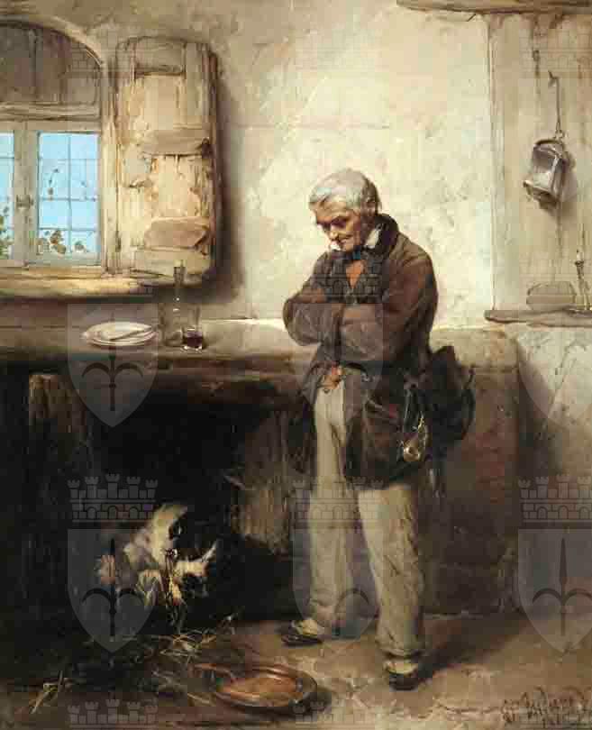 Un'altra figura di vecchio, un altro personaggio che ritorna dopo esser già comparso in un dipinto di poco precedente, ovvero in Il cacciatore (o Il racconto del cacciatore), esposto a Brera nel 1854, acquistato dalla medesima Accademia, tuttora nelle collezioni della Pinacoteca. E in effetti i cataloghi del Museo risalenti agli anni venti citano un Cacciatore di Domenico Induno, che sicuramente fa riferimento a questo dipinto. Lo stesso personaggio che qui accudisce al suo cane mentre sta mangiando, nel dipinto di Brera è seduto con il fucile nella mano sinistra, appoggiato a terra, e un bicchiere di vino rosso nella destra; si volge verso la bambina, arrampicata, in ginocchio sulla sedia di fronte a lui, pronta ad ascoltare le sue imprese di caccia. E del resto anche il vecchio del dipinto del Revoltella pare avere un fucile sulla sua spalla, accanto alla borraccia posata sul fianco, e dunque potrebbe in effetti essere il medesimo personaggio accanto al suo fedele compagno di caccia. Ricompare anche lo stesso bicchiere di vino rosso, accanto alla bottiglia trasparente e i piatti vicino alla finestra. Il segno più sottile, il soffermarsi del pennello su alcuni oggetti, accomuna questo dipinto agli altri dell'Induno di questo periodo.