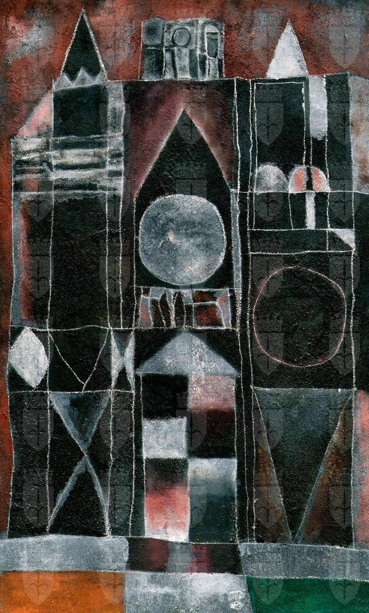 Gentilini si era fatto conoscere a Trieste già nel 1947, in occasione della mostra Gentilini e Tamburi, allestita presso la Galleria d'Arte San Giusto e tra il '51 e il '54 era stato invitato altre cinque volte nel capoluogo giuliano, per partecipare a mostre collettive di grafica e di pittura. Nel 1958 il Museo Revoltella decise di acquistare questa "Cattedrale nera" alla Biennale di Venezia, dove Gentilini aveva una sala personale con 28 lavori del periodo 1954-58. Dedicatosi alla pittura dopo aver lavorato come ceramista nella sua città natale, Faenza, aveva guardato all'Espressionismo della Scuola romana e alla Metafisica. Negli anni '50, ispirato dal Surrealismo di Klee, Chagall e Dubuffet, aveva iniziato a dipingere cattedrali, banchetti sul sagrato e paesaggi, trasformandoli in apparizioni, ironiche e nostalgiche, del suo immaginario fiabesco. Eseguita nel 1957, l'opera in esame appartiene alla produzione matura di Gentilini e tratta uno dei suoi soggetti preferiti. Prive di volumi visti in prospettiva, le sue cattedrali sembrano disegnate con i gessetti colorati dalla mano di un bambino, ma con la sensibilità di un grande maestro, capace di bilanciare pieni e vuoti, tinte chiare e scure. Nell'opera del Museo Revoltella , grazie al confronto con il dipinto "Cattedrale di Valencia" del 1958, sembra di poter riconoscere quest'ultima, visitata dal pittore durante un viaggio assieme alla famiglia nel '57. In quest'anno realizza anche altre due opere con lo stesso soggetto, quasi identiche all'opera in esame ma con fondo chiaro e linee nere. In tutte applica la sua particolare tecnica, basata sulla preparazione del supporto di cartone o tela con uno strato di olio o sabbia, così che le cattedrali sembrano affiorare da una superficie buia o assolata.