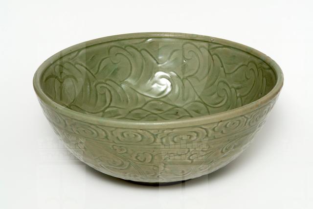 Il bacile "céladon" (qingci) reca un decoro inciso raffigurante girali di loto sovrastati da una fascia con nuvole all’esterno e onde intrecciate all’interno. Un esemplare identico fa parte della collezione di porcellane cinesi di alta qualità offerte nel 1607-1611 dallo scià ‘Abbās I il Grande al santuario di Ardabīl nell’Iran settentrionale, composta da esemplari che risalgono a un periodo compreso fra il 1350 e il 1610.