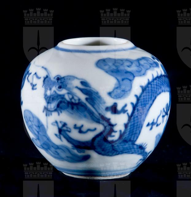 La sagoma sembra derivare da modelli Tang con coperchio in argento dell’VIII sec. Il decoro raffigura un drago a quattro artigli nell’atto di inseguire la perla fiammeggiante (zhu).
