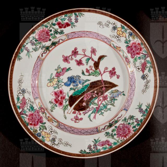 Il piatto – che fa parte di un gruppo di sei piatti di identiche dimensioni, originariamente pertinenti a un servizio (inv. 30034-30039) – mostra al centro del fondo una grande foglia marrone centrale è circondata da rami di susino e peonie azzurre e rosa. Sul cavetto, fascia rosa con motivo a rombi imitante un tessuto, intervallata da quattro riserve contenenti gli “Otto tesori” (ba bao). Lungo la tesa, quattro mazzi di fiori includenti crisantemi e gelsomini. Un piatto simile si conserva nella Royal Collection d'Inghilterra.