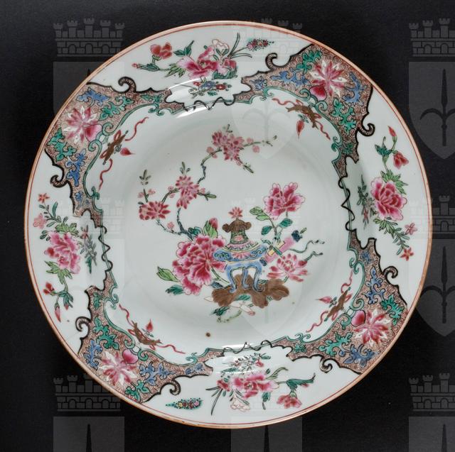 Il piatto – che fa parte di un gruppo di sei piatti di identiche dimensioni, originariamente pertinenti a un servizio (inv. 30068-30073) – mostra al centro una composizione con un recipiente panciuto, forse un incensiere tripode, un rotolo dipinto, fiori di peonia e di pruno.